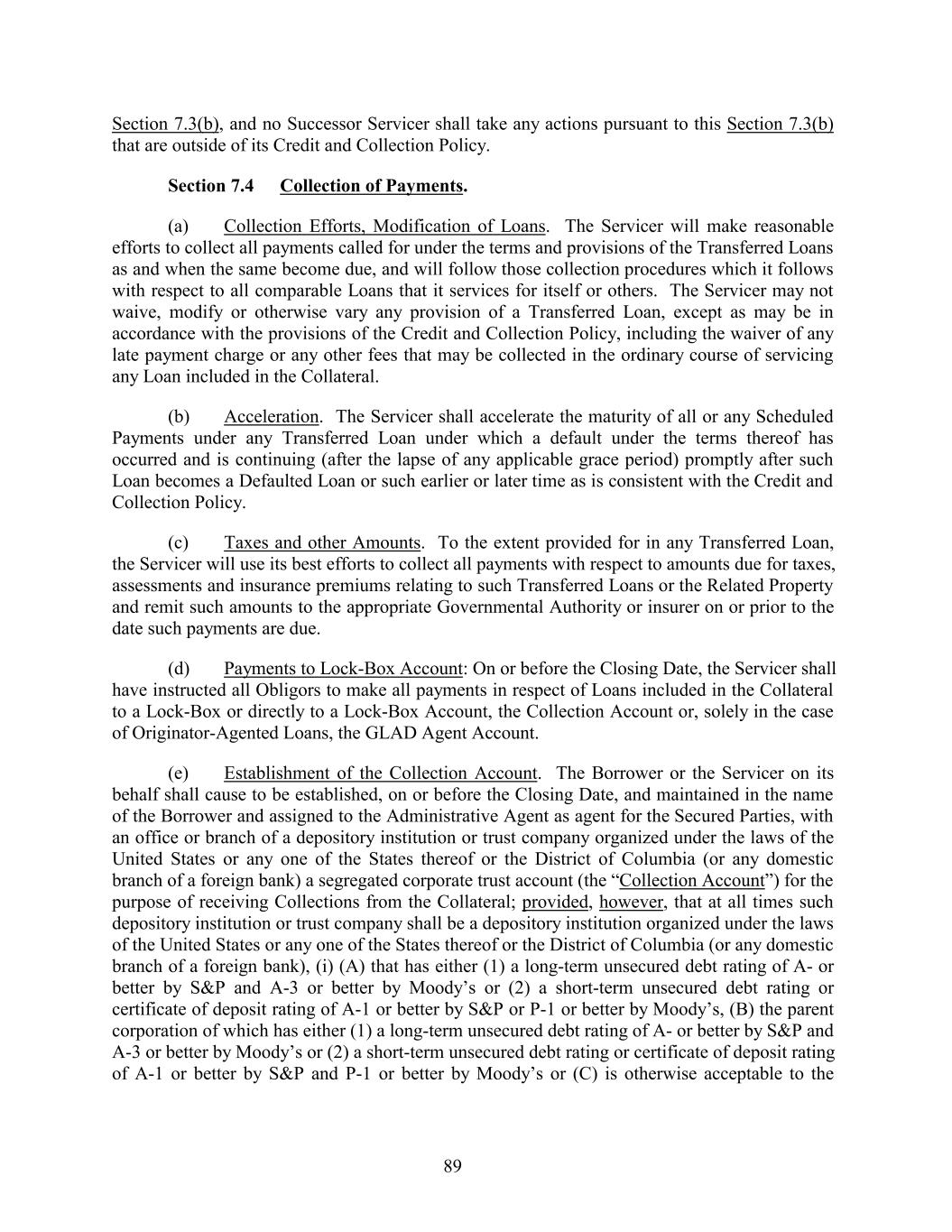 Section 7.3(b), and no Successor Servicer shall take any actions pursuant to this Section 7.3(b) that are outside of its Credit and Collection Policy. Section 7.4 Collection of Payments. (a) Collection Efforts, Modification of Loans. The Servicer will make reasonable efforts to collect all payments called for under the terms and provisions of the Transferred Loans as and when the same become due, and will follow those collection procedures which it follows with respect to all comparable Loans that it services for itself or others. The Servicer may not waive, modify or otherwise vary any provision of a Transferred Loan, except as may be in accordance with the provisions of the Credit and Collection Policy, including the waiver of any late payment charge or any other fees that may be collected in the ordinary course of servicing any Loan included in the Collateral. (b) Acceleration. The Servicer shall accelerate the maturity of all or any Scheduled Payments under any Transferred Loan under which a default under the terms thereof has occurred and is continuing (after the lapse of any applicable grace period) promptly after such Loan becomes a Defaulted Loan or such earlier or later time as is consistent with the Credit and Collection Policy. (c) Taxes and other Amounts. To the extent provided for in any Transferred Loan, the Servicer will use its best efforts to collect all payments with respect to amounts due for taxes, assessments and insurance premiums relating to such Transferred Loans or the Related Property and remit such amounts to the appropriate Governmental Authority or insurer on or prior to the date such payments are due. (d) Payments to Lock-Box Account: On or before the Closing Date, the Servicer shall have instructed all Obligors to make all payments in respect of Loans included in the Collateral to a Lock-Box or directly to a Lock-Box Account, the Collection Account or, solely in the case of Originator-Agented Loans, the GLAD Agent Account. (e) Establishment of the Collection Account. The Borrower or the Servicer on its behalf shall cause to be established, on or before the Closing Date, and maintained in the name of the Borrower and assigned to the Administrative Agent as agent for the Secured Parties, with an office or branch of a depository institution or trust company organized under the laws of the United States or any one of the States thereof or the District of Columbia (or any domestic branch of a foreign bank) a segregated corporate trust account (the “Collection Account”) for the purpose of receiving Collections from the Collateral; provided, however, that at all times such depository institution or trust company shall be a depository institution organized under the laws of the United States or any one of the States thereof or the District of Columbia (or any domestic branch of a foreign bank), (i) (A) that has either (1) a long-term unsecured debt rating of A- or better by S&P and A-3 or better by Moody’s or (2) a short-term unsecured debt rating or certificate of deposit rating of A-1 or better by S&P or P-1 or better by Moody’s, (B) the parent corporation of which has either (1) a long-term unsecured debt rating of A- or better by S&P and A-3 or better by Moody’s or (2) a short-term unsecured debt rating or certificate of deposit rating of A-1 or better by S&P and P-1 or better by Moody’s or (C) is otherwise acceptable to the 89