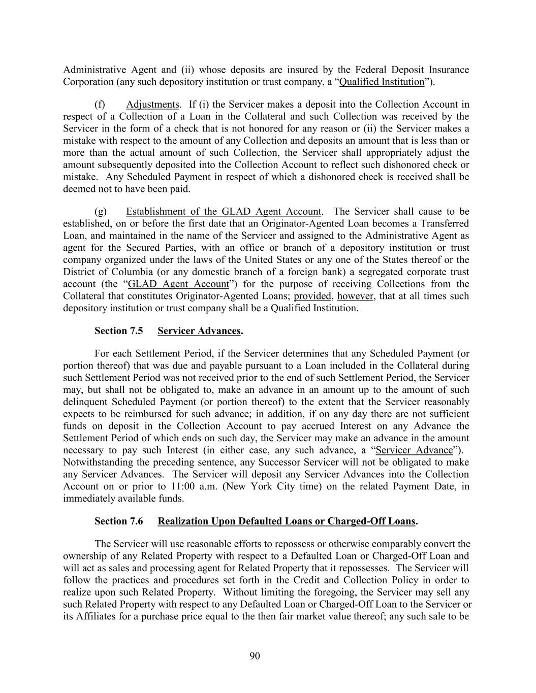 Administrative Agent and (ii) whose deposits are insured by the Federal Deposit Insurance Corporation (any such depository institution or trust company, a “Qualified Institution”). (f) Adjustments. If (i) the Servicer makes a deposit into the Collection Account in respect of a Collection of a Loan in the Collateral and such Collection was received by the Servicer in the form of a check that is not honored for any reason or (ii) the Servicer makes a mistake with respect to the amount of any Collection and deposits an amount that is less than or more than the actual amount of such Collection, the Servicer shall appropriately adjust the amount subsequently deposited into the Collection Account to reflect such dishonored check or mistake. Any Scheduled Payment in respect of which a dishonored check is received shall be deemed not to have been paid. (g) Establishment of the GLAD Agent Account. The Servicer shall cause to be established, on or before the first date that an Originator-Agented Loan becomes a Transferred Loan, and maintained in the name of the Servicer and assigned to the Administrative Agent as agent for the Secured Parties, with an office or branch of a depository institution or trust company organized under the laws of the United States or any one of the States thereof or the District of Columbia (or any domestic branch of a foreign bank) a segregated corporate trust account (the “GLAD Agent Account”) for the purpose of receiving Collections from the Collateral that constitutes Originator-Agented Loans; provided, however, that at all times such depository institution or trust company shall be a Qualified Institution. Section 7.5 Servicer Advances. For each Settlement Period, if the Servicer determines that any Scheduled Payment (or portion thereof) that was due and payable pursuant to a Loan included in the Collateral during such Settlement Period was not received prior to the end of such Settlement Period, the Servicer may, but shall not be obligated to, make an advance in an amount up to the amount of such delinquent Scheduled Payment (or portion thereof) to the extent that the Servicer reasonably expects to be reimbursed for such advance; in addition, if on any day there are not sufficient funds on deposit in the Collection Account to pay accrued Interest on any Advance the Settlement Period of which ends on such day, the Servicer may make an advance in the amount necessary to pay such Interest (in either case, any such advance, a “Servicer Advance”). Notwithstanding the preceding sentence, any Successor Servicer will not be obligated to make any Servicer Advances. The Servicer will deposit any Servicer Advances into the Collection Account on or prior to 11:00 a.m. (New York City time) on the related Payment Date, in immediately available funds. Section 7.6 Realization Upon Defaulted Loans or Charged-Off Loans. The Servicer will use reasonable efforts to repossess or otherwise comparably convert the ownership of any Related Property with respect to a Defaulted Loan or Charged-Off Loan and will act as sales and processing agent for Related Property that it repossesses. The Servicer will follow the practices and procedures set forth in the Credit and Collection Policy in order to realize upon such Related Property. Without limiting the foregoing, the Servicer may sell any such Related Property with respect to any Defaulted Loan or Charged-Off Loan to the Servicer or its Affiliates for a purchase price equal to the then fair market value thereof; any such sale to be 90