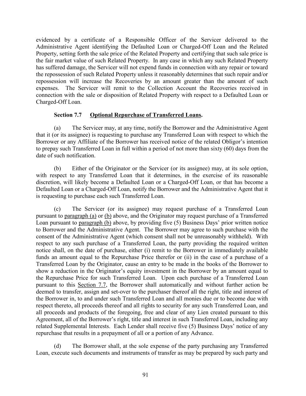 evidenced by a certificate of a Responsible Officer of the Servicer delivered to the Administrative Agent identifying the Defaulted Loan or Charged-Off Loan and the Related Property, setting forth the sale price of the Related Property and certifying that such sale price is the fair market value of such Related Property. In any case in which any such Related Property has suffered damage, the Servicer will not expend funds in connection with any repair or toward the repossession of such Related Property unless it reasonably determines that such repair and/or repossession will increase the Recoveries by an amount greater than the amount of such expenses. The Servicer will remit to the Collection Account the Recoveries received in connection with the sale or disposition of Related Property with respect to a Defaulted Loan or Charged-Off Loan. Section 7.7 Optional Repurchase of Transferred Loans. (a) The Servicer may, at any time, notify the Borrower and the Administrative Agent that it (or its assignee) is requesting to purchase any Transferred Loan with respect to which the Borrower or any Affiliate of the Borrower has received notice of the related Obligor’s intention to prepay such Transferred Loan in full within a period of not more than sixty (60) days from the date of such notification. (b) Either of the Originator or the Servicer (or its assignee) may, at its sole option, with respect to any Transferred Loan that it determines, in the exercise of its reasonable discretion, will likely become a Defaulted Loan or a Charged-Off Loan, or that has become a Defaulted Loan or a Charged-Off Loan, notify the Borrower and the Administrative Agent that it is requesting to purchase each such Transferred Loan. (c) The Servicer (or its assignee) may request purchase of a Transferred Loan pursuant to paragraph (a) or (b) above, and the Originator may request purchase of a Transferred Loan pursuant to paragraph (b) above, by providing five (5) Business Days’ prior written notice to Borrower and the Administrative Agent. The Borrower may agree to such purchase with the consent of the Administrative Agent (which consent shall not be unreasonably withheld). With respect to any such purchase of a Transferred Loan, the party providing the required written notice shall, on the date of purchase, either (i) remit to the Borrower in immediately available funds an amount equal to the Repurchase Price therefor or (ii) in the case of a purchase of a Transferred Loan by the Originator, cause an entry to be made in the books of the Borrower to show a reduction in the Originator’s equity investment in the Borrower by an amount equal to the Repurchase Price for such Transferred Loan. Upon each purchase of a Transferred Loan pursuant to this Section 7.7, the Borrower shall automatically and without further action be deemed to transfer, assign and set-over to the purchaser thereof all the right, title and interest of the Borrower in, to and under such Transferred Loan and all monies due or to become due with respect thereto, all proceeds thereof and all rights to security for any such Transferred Loan, and all proceeds and products of the foregoing, free and clear of any Lien created pursuant to this Agreement, all of the Borrower’s right, title and interest in such Transferred Loan, including any related Supplemental Interests. Each Lender shall receive five (5) Business Days’ notice of any repurchase that results in a prepayment of all or a portion of any Advance. (d) The Borrower shall, at the sole expense of the party purchasing any Transferred Loan, execute such documents and instruments of transfer as may be prepared by such party and 91