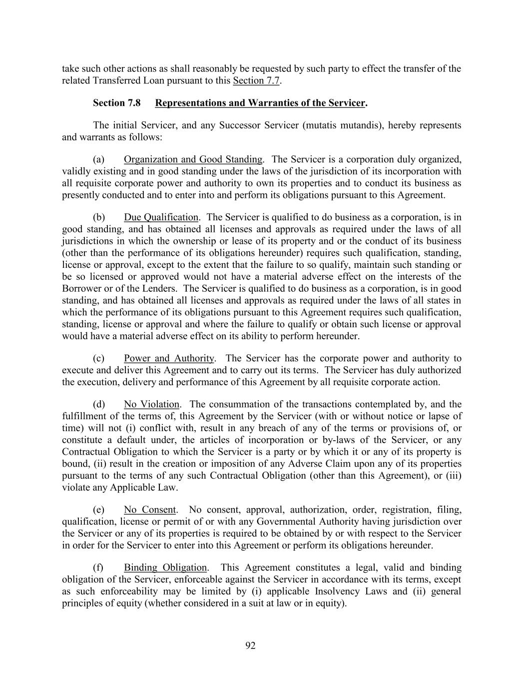 take such other actions as shall reasonably be requested by such party to effect the transfer of the related Transferred Loan pursuant to this Section 7.7. Section 7.8 Representations and Warranties of the Servicer. The initial Servicer, and any Successor Servicer (mutatis mutandis), hereby represents and warrants as follows: (a) Organization and Good Standing. The Servicer is a corporation duly organized, validly existing and in good standing under the laws of the jurisdiction of its incorporation with all requisite corporate power and authority to own its properties and to conduct its business as presently conducted and to enter into and perform its obligations pursuant to this Agreement. (b) Due Qualification. The Servicer is qualified to do business as a corporation, is in good standing, and has obtained all licenses and approvals as required under the laws of all jurisdictions in which the ownership or lease of its property and or the conduct of its business (other than the performance of its obligations hereunder) requires such qualification, standing, license or approval, except to the extent that the failure to so qualify, maintain such standing or be so licensed or approved would not have a material adverse effect on the interests of the Borrower or of the Lenders. The Servicer is qualified to do business as a corporation, is in good standing, and has obtained all licenses and approvals as required under the laws of all states in which the performance of its obligations pursuant to this Agreement requires such qualification, standing, license or approval and where the failure to qualify or obtain such license or approval would have a material adverse effect on its ability to perform hereunder. (c) Power and Authority. The Servicer has the corporate power and authority to execute and deliver this Agreement and to carry out its terms. The Servicer has duly authorized the execution, delivery and performance of this Agreement by all requisite corporate action. (d) No Violation. The consummation of the transactions contemplated by, and the fulfillment of the terms of, this Agreement by the Servicer (with or without notice or lapse of time) will not (i) conflict with, result in any breach of any of the terms or provisions of, or constitute a default under, the articles of incorporation or by-laws of the Servicer, or any Contractual Obligation to which the Servicer is a party or by which it or any of its property is bound, (ii) result in the creation or imposition of any Adverse Claim upon any of its properties pursuant to the terms of any such Contractual Obligation (other than this Agreement), or (iii) violate any Applicable Law. (e) No Consent. No consent, approval, authorization, order, registration, filing, qualification, license or permit of or with any Governmental Authority having jurisdiction over the Servicer or any of its properties is required to be obtained by or with respect to the Servicer in order for the Servicer to enter into this Agreement or perform its obligations hereunder. (f) Binding Obligation. This Agreement constitutes a legal, valid and binding obligation of the Servicer, enforceable against the Servicer in accordance with its terms, except as such enforceability may be limited by (i) applicable Insolvency Laws and (ii) general principles of equity (whether considered in a suit at law or in equity). 92