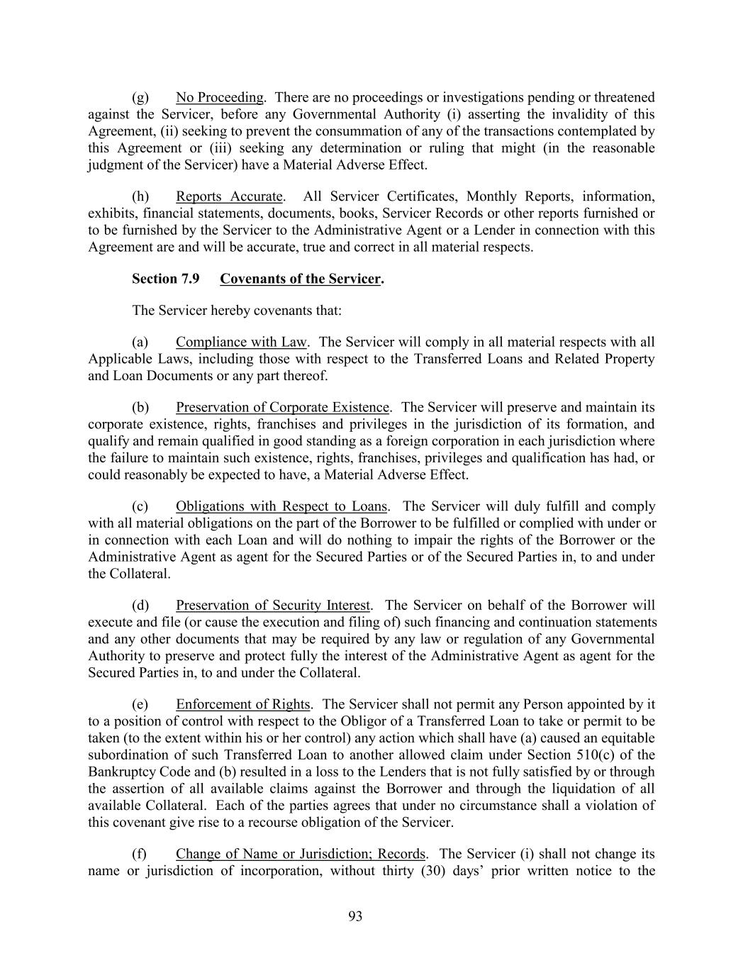 (g) No Proceeding. There are no proceedings or investigations pending or threatened against the Servicer, before any Governmental Authority (i) asserting the invalidity of this Agreement, (ii) seeking to prevent the consummation of any of the transactions contemplated by this Agreement or (iii) seeking any determination or ruling that might (in the reasonable judgment of the Servicer) have a Material Adverse Effect. (h) Reports Accurate. All Servicer Certificates, Monthly Reports, information, exhibits, financial statements, documents, books, Servicer Records or other reports furnished or to be furnished by the Servicer to the Administrative Agent or a Lender in connection with this Agreement are and will be accurate, true and correct in all material respects. Section 7.9 Covenants of the Servicer. The Servicer hereby covenants that: (a) Compliance with Law. The Servicer will comply in all material respects with all Applicable Laws, including those with respect to the Transferred Loans and Related Property and Loan Documents or any part thereof. (b) Preservation of Corporate Existence. The Servicer will preserve and maintain its corporate existence, rights, franchises and privileges in the jurisdiction of its formation, and qualify and remain qualified in good standing as a foreign corporation in each jurisdiction where the failure to maintain such existence, rights, franchises, privileges and qualification has had, or could reasonably be expected to have, a Material Adverse Effect. (c) Obligations with Respect to Loans. The Servicer will duly fulfill and comply with all material obligations on the part of the Borrower to be fulfilled or complied with under or in connection with each Loan and will do nothing to impair the rights of the Borrower or the Administrative Agent as agent for the Secured Parties or of the Secured Parties in, to and under the Collateral. (d) Preservation of Security Interest. The Servicer on behalf of the Borrower will execute and file (or cause the execution and filing of) such financing and continuation statements and any other documents that may be required by any law or regulation of any Governmental Authority to preserve and protect fully the interest of the Administrative Agent as agent for the Secured Parties in, to and under the Collateral. (e) Enforcement of Rights. The Servicer shall not permit any Person appointed by it to a position of control with respect to the Obligor of a Transferred Loan to take or permit to be taken (to the extent within his or her control) any action which shall have (a) caused an equitable subordination of such Transferred Loan to another allowed claim under Section 510(c) of the Bankruptcy Code and (b) resulted in a loss to the Lenders that is not fully satisfied by or through the assertion of all available claims against the Borrower and through the liquidation of all available Collateral. Each of the parties agrees that under no circumstance shall a violation of this covenant give rise to a recourse obligation of the Servicer. (f) Change of Name or Jurisdiction; Records. The Servicer (i) shall not change its name or jurisdiction of incorporation, without thirty (30) days’ prior written notice to the 93