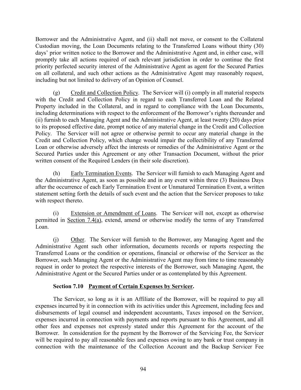 Borrower and the Administrative Agent, and (ii) shall not move, or consent to the Collateral Custodian moving, the Loan Documents relating to the Transferred Loans without thirty (30) days’ prior written notice to the Borrower and the Administrative Agent and, in either case, will promptly take all actions required of each relevant jurisdiction in order to continue the first priority perfected security interest of the Administrative Agent as agent for the Secured Parties on all collateral, and such other actions as the Administrative Agent may reasonably request, including but not limited to delivery of an Opinion of Counsel. (g) Credit and Collection Policy. The Servicer will (i) comply in all material respects with the Credit and Collection Policy in regard to each Transferred Loan and the Related Property included in the Collateral, and in regard to compliance with the Loan Documents, including determinations with respect to the enforcement of the Borrower’s rights thereunder and (ii) furnish to each Managing Agent and the Administrative Agent, at least twenty (20) days prior to its proposed effective date, prompt notice of any material change in the Credit and Collection Policy. The Servicer will not agree or otherwise permit to occur any material change in the Credit and Collection Policy, which change would impair the collectibility of any Transferred Loan or otherwise adversely affect the interests or remedies of the Administrative Agent or the Secured Parties under this Agreement or any other Transaction Document, without the prior written consent of the Required Lenders (in their sole discretion). (h) Early Termination Events. The Servicer will furnish to each Managing Agent and the Administrative Agent, as soon as possible and in any event within three (3) Business Days after the occurrence of each Early Termination Event or Unmatured Termination Event, a written statement setting forth the details of such event and the action that the Servicer proposes to take with respect thereto. (i) Extension or Amendment of Loans. The Servicer will not, except as otherwise permitted in Section 7.4(a), extend, amend or otherwise modify the terms of any Transferred Loan. (j) Other. The Servicer will furnish to the Borrower, any Managing Agent and the Administrative Agent such other information, documents records or reports respecting the Transferred Loans or the condition or operations, financial or otherwise of the Servicer as the Borrower, such Managing Agent or the Administrative Agent may from time to time reasonably request in order to protect the respective interests of the Borrower, such Managing Agent, the Administrative Agent or the Secured Parties under or as contemplated by this Agreement. Section 7.10 Payment of Certain Expenses by Servicer. The Servicer, so long as it is an Affiliate of the Borrower, will be required to pay all expenses incurred by it in connection with its activities under this Agreement, including fees and disbursements of legal counsel and independent accountants, Taxes imposed on the Servicer, expenses incurred in connection with payments and reports pursuant to this Agreement, and all other fees and expenses not expressly stated under this Agreement for the account of the Borrower. In consideration for the payment by the Borrower of the Servicing Fee, the Servicer will be required to pay all reasonable fees and expenses owing to any bank or trust company in connection with the maintenance of the Collection Account and the Backup Servicer Fee 94