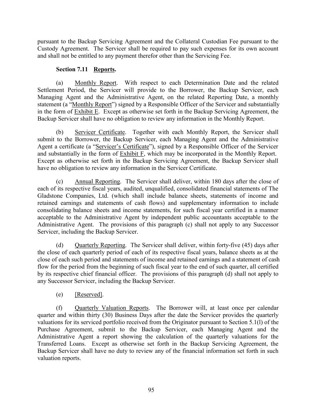 pursuant to the Backup Servicing Agreement and the Collateral Custodian Fee pursuant to the Custody Agreement. The Servicer shall be required to pay such expenses for its own account and shall not be entitled to any payment therefor other than the Servicing Fee. Section 7.11 Reports. (a) Monthly Report. With respect to each Determination Date and the related Settlement Period, the Servicer will provide to the Borrower, the Backup Servicer, each Managing Agent and the Administrative Agent, on the related Reporting Date, a monthly statement (a “Monthly Report”) signed by a Responsible Officer of the Servicer and substantially in the form of Exhibit E. Except as otherwise set forth in the Backup Servicing Agreement, the Backup Servicer shall have no obligation to review any information in the Monthly Report. (b) Servicer Certificate. Together with each Monthly Report, the Servicer shall submit to the Borrower, the Backup Servicer, each Managing Agent and the Administrative Agent a certificate (a “Servicer’s Certificate”), signed by a Responsible Officer of the Servicer and substantially in the form of Exhibit F, which may be incorporated in the Monthly Report. Except as otherwise set forth in the Backup Servicing Agreement, the Backup Servicer shall have no obligation to review any information in the Servicer Certificate. (c) Annual Reporting. The Servicer shall deliver, within 180 days after the close of each of its respective fiscal years, audited, unqualified, consolidated financial statements of The Gladstone Companies, Ltd. (which shall include balance sheets, statements of income and retained earnings and statements of cash flows) and supplementary information to include consolidating balance sheets and income statements, for such fiscal year certified in a manner acceptable to the Administrative Agent by independent public accountants acceptable to the Administrative Agent. The provisions of this paragraph (c) shall not apply to any Successor Servicer, including the Backup Servicer. (d) Quarterly Reporting. The Servicer shall deliver, within forty-five (45) days after the close of each quarterly period of each of its respective fiscal years, balance sheets as at the close of each such period and statements of income and retained earnings and a statement of cash flow for the period from the beginning of such fiscal year to the end of such quarter, all certified by its respective chief financial officer. The provisions of this paragraph (d) shall not apply to any Successor Servicer, including the Backup Servicer. (e) [Reserved]. (f) Quarterly Valuation Reports. The Borrower will, at least once per calendar quarter and within thirty (30) Business Days after the date the Servicer provides the quarterly valuations for its serviced portfolio received from the Originator pursuant to Section 5.1(l) of the Purchase Agreement, submit to the Backup Servicer, each Managing Agent and the Administrative Agent a report showing the calculation of the quarterly valuations for the Transferred Loans. Except as otherwise set forth in the Backup Servicing Agreement, the Backup Servicer shall have no duty to review any of the financial information set forth in such valuation reports. 95