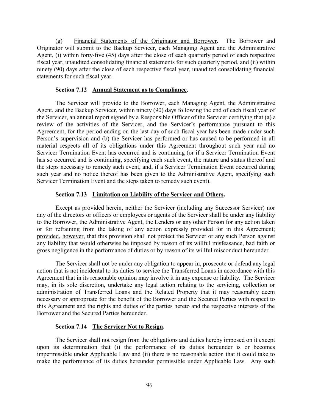 (g) Financial Statements of the Originator and Borrower. The Borrower and Originator will submit to the Backup Servicer, each Managing Agent and the Administrative Agent, (i) within forty-five (45) days after the close of each quarterly period of each respective fiscal year, unaudited consolidating financial statements for such quarterly period, and (ii) within ninety (90) days after the close of each respective fiscal year, unaudited consolidating financial statements for such fiscal year. Section 7.12 Annual Statement as to Compliance. The Servicer will provide to the Borrower, each Managing Agent, the Administrative Agent, and the Backup Servicer, within ninety (90) days following the end of each fiscal year of the Servicer, an annual report signed by a Responsible Officer of the Servicer certifying that (a) a review of the activities of the Servicer, and the Servicer’s performance pursuant to this Agreement, for the period ending on the last day of such fiscal year has been made under such Person’s supervision and (b) the Servicer has performed or has caused to be performed in all material respects all of its obligations under this Agreement throughout such year and no Servicer Termination Event has occurred and is continuing (or if a Servicer Termination Event has so occurred and is continuing, specifying each such event, the nature and status thereof and the steps necessary to remedy such event, and, if a Servicer Termination Event occurred during such year and no notice thereof has been given to the Administrative Agent, specifying such Servicer Termination Event and the steps taken to remedy such event). Section 7.13 Limitation on Liability of the Servicer and Others. Except as provided herein, neither the Servicer (including any Successor Servicer) nor any of the directors or officers or employees or agents of the Servicer shall be under any liability to the Borrower, the Administrative Agent, the Lenders or any other Person for any action taken or for refraining from the taking of any action expressly provided for in this Agreement; provided, however, that this provision shall not protect the Servicer or any such Person against any liability that would otherwise be imposed by reason of its willful misfeasance, bad faith or gross negligence in the performance of duties or by reason of its willful misconduct hereunder. The Servicer shall not be under any obligation to appear in, prosecute or defend any legal action that is not incidental to its duties to service the Transferred Loans in accordance with this Agreement that in its reasonable opinion may involve it in any expense or liability. The Servicer may, in its sole discretion, undertake any legal action relating to the servicing, collection or administration of Transferred Loans and the Related Property that it may reasonably deem necessary or appropriate for the benefit of the Borrower and the Secured Parties with respect to this Agreement and the rights and duties of the parties hereto and the respective interests of the Borrower and the Secured Parties hereunder. Section 7.14 The Servicer Not to Resign. The Servicer shall not resign from the obligations and duties hereby imposed on it except upon its determination that (i) the performance of its duties hereunder is or becomes impermissible under Applicable Law and (ii) there is no reasonable action that it could take to make the performance of its duties hereunder permissible under Applicable Law. Any such 96