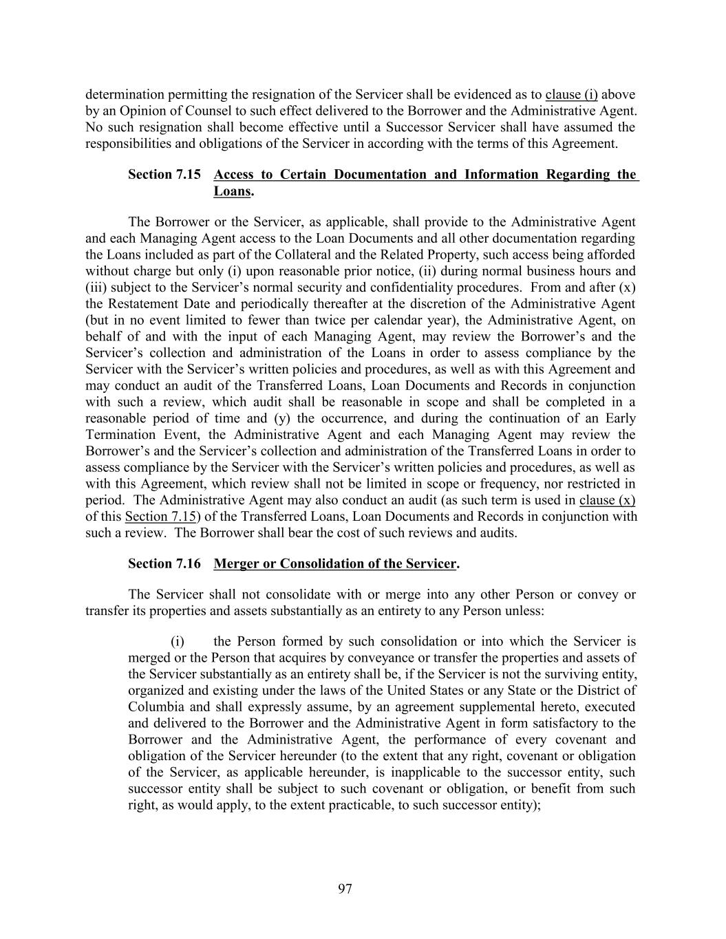 determination permitting the resignation of the Servicer shall be evidenced as to clause (i) above by an Opinion of Counsel to such effect delivered to the Borrower and the Administrative Agent. No such resignation shall become effective until a Successor Servicer shall have assumed the responsibilities and obligations of the Servicer in according with the terms of this Agreement. Section 7.15 Access to Certain Documentation and Information Regarding the Loans. The Borrower or the Servicer, as applicable, shall provide to the Administrative Agent and each Managing Agent access to the Loan Documents and all other documentation regarding the Loans included as part of the Collateral and the Related Property, such access being afforded without charge but only (i) upon reasonable prior notice, (ii) during normal business hours and (iii) subject to the Servicer’s normal security and confidentiality procedures. From and after (x) the Restatement Date and periodically thereafter at the discretion of the Administrative Agent (but in no event limited to fewer than twice per calendar year), the Administrative Agent, on behalf of and with the input of each Managing Agent, may review the Borrower’s and the Servicer’s collection and administration of the Loans in order to assess compliance by the Servicer with the Servicer’s written policies and procedures, as well as with this Agreement and may conduct an audit of the Transferred Loans, Loan Documents and Records in conjunction with such a review, which audit shall be reasonable in scope and shall be completed in a reasonable period of time and (y) the occurrence, and during the continuation of an Early Termination Event, the Administrative Agent and each Managing Agent may review the Borrower’s and the Servicer’s collection and administration of the Transferred Loans in order to assess compliance by the Servicer with the Servicer’s written policies and procedures, as well as with this Agreement, which review shall not be limited in scope or frequency, nor restricted in period. The Administrative Agent may also conduct an audit (as such term is used in clause (x) of this Section 7.15) of the Transferred Loans, Loan Documents and Records in conjunction with such a review. The Borrower shall bear the cost of such reviews and audits. Section 7.16 Merger or Consolidation of the Servicer. The Servicer shall not consolidate with or merge into any other Person or convey or transfer its properties and assets substantially as an entirety to any Person unless: (i) the Person formed by such consolidation or into which the Servicer is merged or the Person that acquires by conveyance or transfer the properties and assets of the Servicer substantially as an entirety shall be, if the Servicer is not the surviving entity, organized and existing under the laws of the United States or any State or the District of Columbia and shall expressly assume, by an agreement supplemental hereto, executed and delivered to the Borrower and the Administrative Agent in form satisfactory to the Borrower and the Administrative Agent, the performance of every covenant and obligation of the Servicer hereunder (to the extent that any right, covenant or obligation of the Servicer, as applicable hereunder, is inapplicable to the successor entity, such successor entity shall be subject to such covenant or obligation, or benefit from such right, as would apply, to the extent practicable, to such successor entity); 97