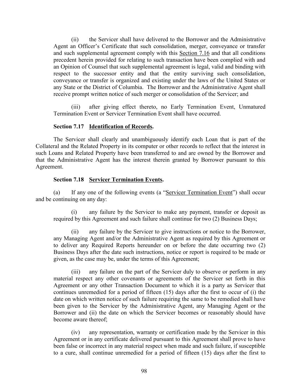 (ii) the Servicer shall have delivered to the Borrower and the Administrative Agent an Officer’s Certificate that such consolidation, merger, conveyance or transfer and such supplemental agreement comply with this Section 7.16 and that all conditions precedent herein provided for relating to such transaction have been complied with and an Opinion of Counsel that such supplemental agreement is legal, valid and binding with respect to the successor entity and that the entity surviving such consolidation, conveyance or transfer is organized and existing under the laws of the United States or any State or the District of Columbia. The Borrower and the Administrative Agent shall receive prompt written notice of such merger or consolidation of the Servicer; and (iii) after giving effect thereto, no Early Termination Event, Unmatured Termination Event or Servicer Termination Event shall have occurred. Section 7.17 Identification of Records. The Servicer shall clearly and unambiguously identify each Loan that is part of the Collateral and the Related Property in its computer or other records to reflect that the interest in such Loans and Related Property have been transferred to and are owned by the Borrower and that the Administrative Agent has the interest therein granted by Borrower pursuant to this Agreement. Section 7.18 Servicer Termination Events. (a) If any one of the following events (a “Servicer Termination Event”) shall occur and be continuing on any day: (i) any failure by the Servicer to make any payment, transfer or deposit as required by this Agreement and such failure shall continue for two (2) Business Days; (ii) any failure by the Servicer to give instructions or notice to the Borrower, any Managing Agent and/or the Administrative Agent as required by this Agreement or to deliver any Required Reports hereunder on or before the date occurring two (2) Business Days after the date such instructions, notice or report is required to be made or given, as the case may be, under the terms of this Agreement; (iii) any failure on the part of the Servicer duly to observe or perform in any material respect any other covenants or agreements of the Servicer set forth in this Agreement or any other Transaction Document to which it is a party as Servicer that continues unremedied for a period of fifteen (15) days after the first to occur of (i) the date on which written notice of such failure requiring the same to be remedied shall have been given to the Servicer by the Administrative Agent, any Managing Agent or the Borrower and (ii) the date on which the Servicer becomes or reasonably should have become aware thereof; (iv) any representation, warranty or certification made by the Servicer in this Agreement or in any certificate delivered pursuant to this Agreement shall prove to have been false or incorrect in any material respect when made and such failure, if susceptible to a cure, shall continue unremedied for a period of fifteen (15) days after the first to 98