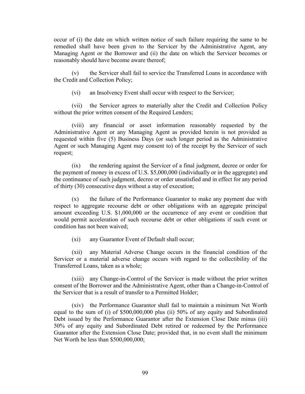occur of (i) the date on which written notice of such failure requiring the same to be remedied shall have been given to the Servicer by the Administrative Agent, any Managing Agent or the Borrower and (ii) the date on which the Servicer becomes or reasonably should have become aware thereof; (v) the Servicer shall fail to service the Transferred Loans in accordance with the Credit and Collection Policy; (vi) an Insolvency Event shall occur with respect to the Servicer; (vii) the Servicer agrees to materially alter the Credit and Collection Policy without the prior written consent of the Required Lenders; (viii) any financial or asset information reasonably requested by the Administrative Agent or any Managing Agent as provided herein is not provided as requested within five (5) Business Days (or such longer period as the Administrative Agent or such Managing Agent may consent to) of the receipt by the Servicer of such request; (ix) the rendering against the Servicer of a final judgment, decree or order for the payment of money in excess of U.S. $5,000,000 (individually or in the aggregate) and the continuance of such judgment, decree or order unsatisfied and in effect for any period of thirty (30) consecutive days without a stay of execution; (x) the failure of the Performance Guarantor to make any payment due with respect to aggregate recourse debt or other obligations with an aggregate principal amount exceeding U.S. $1,000,000 or the occurrence of any event or condition that would permit acceleration of such recourse debt or other obligations if such event or condition has not been waived; (xi) any Guarantor Event of Default shall occur; (xii) any Material Adverse Change occurs in the financial condition of the Servicer or a material adverse change occurs with regard to the collectibility of the Transferred Loans, taken as a whole; (xiii) any Change-in-Control of the Servicer is made without the prior written consent of the Borrower and the Administrative Agent, other than a Change-in-Control of the Servicer that is a result of transfer to a Permitted Holder; (xiv) the Performance Guarantor shall fail to maintain a minimum Net Worth equal to the sum of (i) of $500,000,000 plus (ii) 50% of any equity and Subordinated Debt issued by the Performance Guarantor after the Extension Close Date minus (iii) 50% of any equity and Subordinated Debt retired or redeemed by the Performance Guarantor after the Extension Close Date; provided that, in no event shall the minimum Net Worth be less than $500,000,000; 99