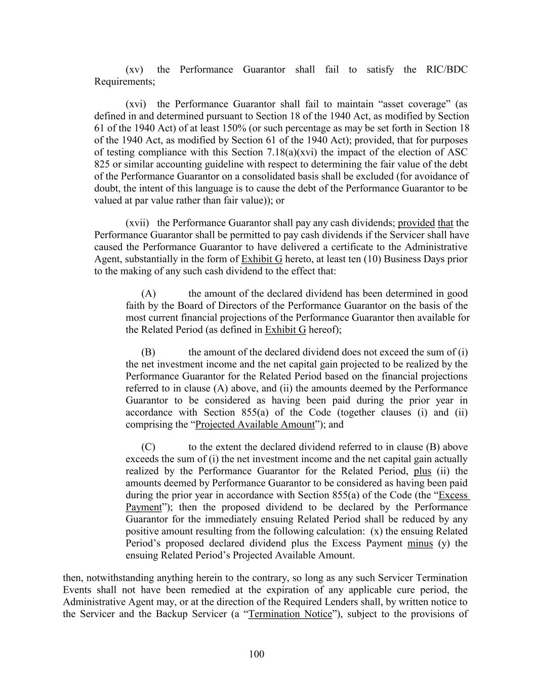 (xv) the Performance Guarantor shall fail to satisfy the RIC/BDC Requirements; (xvi) the Performance Guarantor shall fail to maintain “asset coverage” (as defined in and determined pursuant to Section 18 of the 1940 Act, as modified by Section 61 of the 1940 Act) of at least 150% (or such percentage as may be set forth in Section 18 of the 1940 Act, as modified by Section 61 of the 1940 Act); provided, that for purposes of testing compliance with this Section 7.18(a)(xvi) the impact of the election of ASC 825 or similar accounting guideline with respect to determining the fair value of the debt of the Performance Guarantor on a consolidated basis shall be excluded (for avoidance of doubt, the intent of this language is to cause the debt of the Performance Guarantor to be valued at par value rather than fair value)); or (xvii) the Performance Guarantor shall pay any cash dividends; provided that the Performance Guarantor shall be permitted to pay cash dividends if the Servicer shall have caused the Performance Guarantor to have delivered a certificate to the Administrative Agent, substantially in the form of Exhibit G hereto, at least ten (10) Business Days prior to the making of any such cash dividend to the effect that: (A) the amount of the declared dividend has been determined in good faith by the Board of Directors of the Performance Guarantor on the basis of the most current financial projections of the Performance Guarantor then available for the Related Period (as defined in Exhibit G hereof); (B) the amount of the declared dividend does not exceed the sum of (i) the net investment income and the net capital gain projected to be realized by the Performance Guarantor for the Related Period based on the financial projections referred to in clause (A) above, and (ii) the amounts deemed by the Performance Guarantor to be considered as having been paid during the prior year in accordance with Section 855(a) of the Code (together clauses (i) and (ii) comprising the “Projected Available Amount”); and (C) to the extent the declared dividend referred to in clause (B) above exceeds the sum of (i) the net investment income and the net capital gain actually realized by the Performance Guarantor for the Related Period, plus (ii) the amounts deemed by Performance Guarantor to be considered as having been paid during the prior year in accordance with Section 855(a) of the Code (the “Excess Payment”); then the proposed dividend to be declared by the Performance Guarantor for the immediately ensuing Related Period shall be reduced by any positive amount resulting from the following calculation: (x) the ensuing Related Period’s proposed declared dividend plus the Excess Payment minus (y) the ensuing Related Period’s Projected Available Amount. then, notwithstanding anything herein to the contrary, so long as any such Servicer Termination Events shall not have been remedied at the expiration of any applicable cure period, the Administrative Agent may, or at the direction of the Required Lenders shall, by written notice to the Servicer and the Backup Servicer (a “Termination Notice”), subject to the provisions of 100