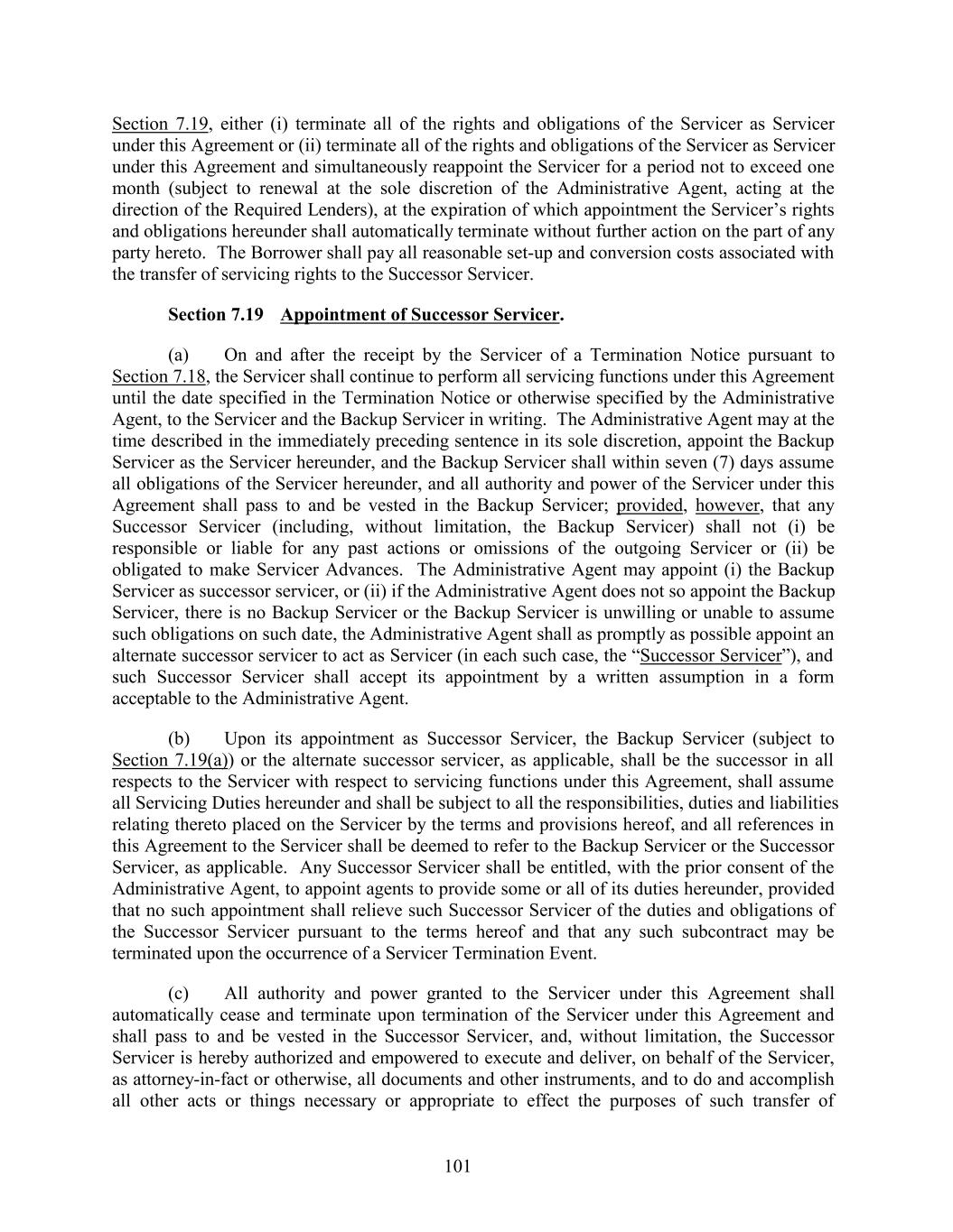 Section 7.19, either (i) terminate all of the rights and obligations of the Servicer as Servicer under this Agreement or (ii) terminate all of the rights and obligations of the Servicer as Servicer under this Agreement and simultaneously reappoint the Servicer for a period not to exceed one month (subject to renewal at the sole discretion of the Administrative Agent, acting at the direction of the Required Lenders), at the expiration of which appointment the Servicer’s rights and obligations hereunder shall automatically terminate without further action on the part of any party hereto. The Borrower shall pay all reasonable set-up and conversion costs associated with the transfer of servicing rights to the Successor Servicer. Section 7.19 Appointment of Successor Servicer. (a) On and after the receipt by the Servicer of a Termination Notice pursuant to Section 7.18, the Servicer shall continue to perform all servicing functions under this Agreement until the date specified in the Termination Notice or otherwise specified by the Administrative Agent, to the Servicer and the Backup Servicer in writing. The Administrative Agent may at the time described in the immediately preceding sentence in its sole discretion, appoint the Backup Servicer as the Servicer hereunder, and the Backup Servicer shall within seven (7) days assume all obligations of the Servicer hereunder, and all authority and power of the Servicer under this Agreement shall pass to and be vested in the Backup Servicer; provided, however, that any Successor Servicer (including, without limitation, the Backup Servicer) shall not (i) be responsible or liable for any past actions or omissions of the outgoing Servicer or (ii) be obligated to make Servicer Advances. The Administrative Agent may appoint (i) the Backup Servicer as successor servicer, or (ii) if the Administrative Agent does not so appoint the Backup Servicer, there is no Backup Servicer or the Backup Servicer is unwilling or unable to assume such obligations on such date, the Administrative Agent shall as promptly as possible appoint an alternate successor servicer to act as Servicer (in each such case, the “Successor Servicer”), and such Successor Servicer shall accept its appointment by a written assumption in a form acceptable to the Administrative Agent. (b) Upon its appointment as Successor Servicer, the Backup Servicer (subject to Section 7.19(a)) or the alternate successor servicer, as applicable, shall be the successor in all respects to the Servicer with respect to servicing functions under this Agreement, shall assume all Servicing Duties hereunder and shall be subject to all the responsibilities, duties and liabilities relating thereto placed on the Servicer by the terms and provisions hereof, and all references in this Agreement to the Servicer shall be deemed to refer to the Backup Servicer or the Successor Servicer, as applicable. Any Successor Servicer shall be entitled, with the prior consent of the Administrative Agent, to appoint agents to provide some or all of its duties hereunder, provided that no such appointment shall relieve such Successor Servicer of the duties and obligations of the Successor Servicer pursuant to the terms hereof and that any such subcontract may be terminated upon the occurrence of a Servicer Termination Event. (c) All authority and power granted to the Servicer under this Agreement shall automatically cease and terminate upon termination of the Servicer under this Agreement and shall pass to and be vested in the Successor Servicer, and, without limitation, the Successor Servicer is hereby authorized and empowered to execute and deliver, on behalf of the Servicer, as attorney-in-fact or otherwise, all documents and other instruments, and to do and accomplish all other acts or things necessary or appropriate to effect the purposes of such transfer of 101