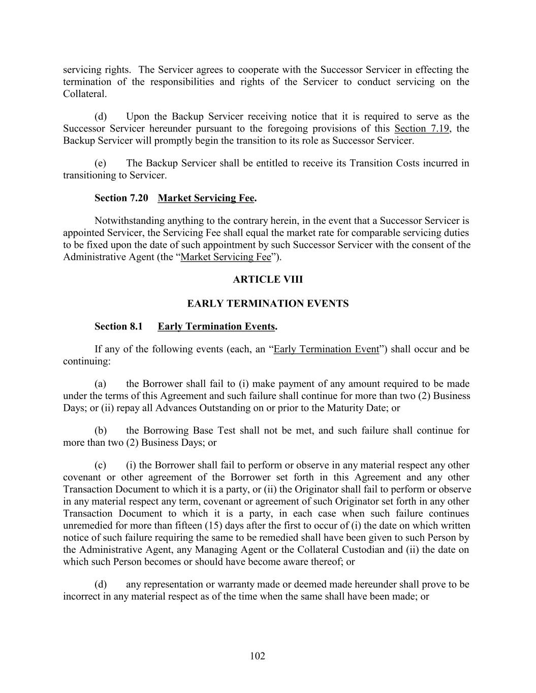 servicing rights. The Servicer agrees to cooperate with the Successor Servicer in effecting the termination of the responsibilities and rights of the Servicer to conduct servicing on the Collateral. (d) Upon the Backup Servicer receiving notice that it is required to serve as the Successor Servicer hereunder pursuant to the foregoing provisions of this Section 7.19, the Backup Servicer will promptly begin the transition to its role as Successor Servicer. (e) The Backup Servicer shall be entitled to receive its Transition Costs incurred in transitioning to Servicer. Section 7.20 Market Servicing Fee. Notwithstanding anything to the contrary herein, in the event that a Successor Servicer is appointed Servicer, the Servicing Fee shall equal the market rate for comparable servicing duties to be fixed upon the date of such appointment by such Successor Servicer with the consent of the Administrative Agent (the “Market Servicing Fee”). ARTICLE VIII EARLY TERMINATION EVENTS Section 8.1 Early Termination Events. If any of the following events (each, an “Early Termination Event”) shall occur and be continuing: (a) the Borrower shall fail to (i) make payment of any amount required to be made under the terms of this Agreement and such failure shall continue for more than two (2) Business Days; or (ii) repay all Advances Outstanding on or prior to the Maturity Date; or (b) the Borrowing Base Test shall not be met, and such failure shall continue for more than two (2) Business Days; or (c) (i) the Borrower shall fail to perform or observe in any material respect any other covenant or other agreement of the Borrower set forth in this Agreement and any other Transaction Document to which it is a party, or (ii) the Originator shall fail to perform or observe in any material respect any term, covenant or agreement of such Originator set forth in any other Transaction Document to which it is a party, in each case when such failure continues unremedied for more than fifteen (15) days after the first to occur of (i) the date on which written notice of such failure requiring the same to be remedied shall have been given to such Person by the Administrative Agent, any Managing Agent or the Collateral Custodian and (ii) the date on which such Person becomes or should have become aware thereof; or (d) any representation or warranty made or deemed made hereunder shall prove to be incorrect in any material respect as of the time when the same shall have been made; or 102