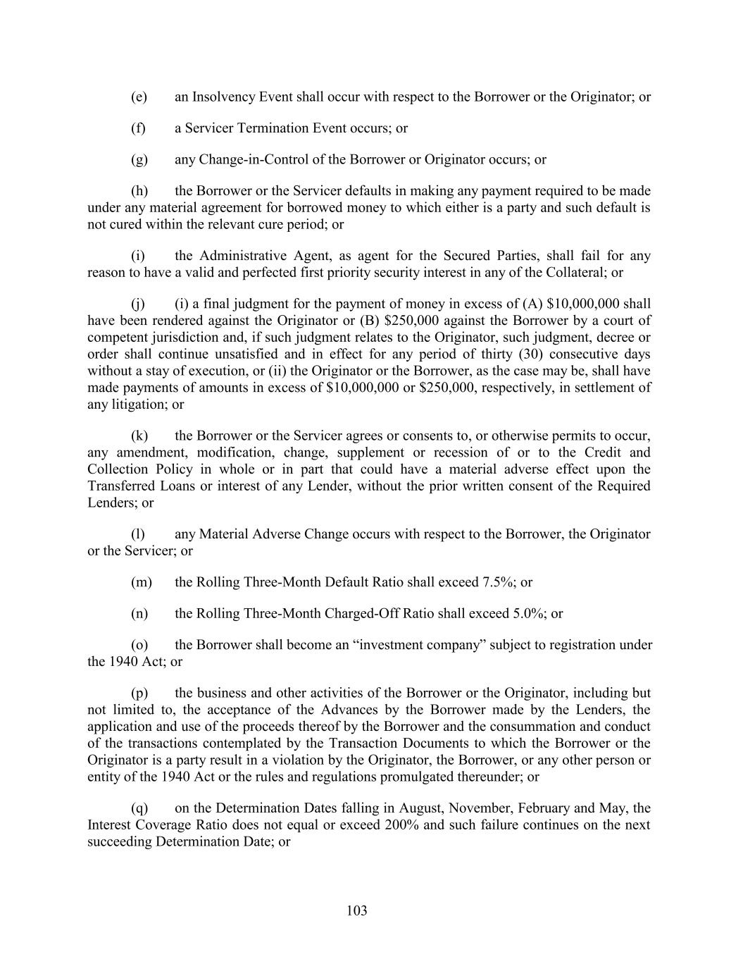 (e) an Insolvency Event shall occur with respect to the Borrower or the Originator; or (f) a Servicer Termination Event occurs; or (g) any Change-in-Control of the Borrower or Originator occurs; or (h) the Borrower or the Servicer defaults in making any payment required to be made under any material agreement for borrowed money to which either is a party and such default is not cured within the relevant cure period; or (i) the Administrative Agent, as agent for the Secured Parties, shall fail for any reason to have a valid and perfected first priority security interest in any of the Collateral; or (j) (i) a final judgment for the payment of money in excess of (A) $10,000,000 shall have been rendered against the Originator or (B) $250,000 against the Borrower by a court of competent jurisdiction and, if such judgment relates to the Originator, such judgment, decree or order shall continue unsatisfied and in effect for any period of thirty (30) consecutive days without a stay of execution, or (ii) the Originator or the Borrower, as the case may be, shall have made payments of amounts in excess of $10,000,000 or $250,000, respectively, in settlement of any litigation; or (k) the Borrower or the Servicer agrees or consents to, or otherwise permits to occur, any amendment, modification, change, supplement or recession of or to the Credit and Collection Policy in whole or in part that could have a material adverse effect upon the Transferred Loans or interest of any Lender, without the prior written consent of the Required Lenders; or (l) any Material Adverse Change occurs with respect to the Borrower, the Originator or the Servicer; or (m) the Rolling Three-Month Default Ratio shall exceed 7.5%; or (n) the Rolling Three-Month Charged-Off Ratio shall exceed 5.0%; or (o) the Borrower shall become an “investment company” subject to registration under the 1940 Act; or (p) the business and other activities of the Borrower or the Originator, including but not limited to, the acceptance of the Advances by the Borrower made by the Lenders, the application and use of the proceeds thereof by the Borrower and the consummation and conduct of the transactions contemplated by the Transaction Documents to which the Borrower or the Originator is a party result in a violation by the Originator, the Borrower, or any other person or entity of the 1940 Act or the rules and regulations promulgated thereunder; or (q) on the Determination Dates falling in August, November, February and May, the Interest Coverage Ratio does not equal or exceed 200% and such failure continues on the next succeeding Determination Date; or 103