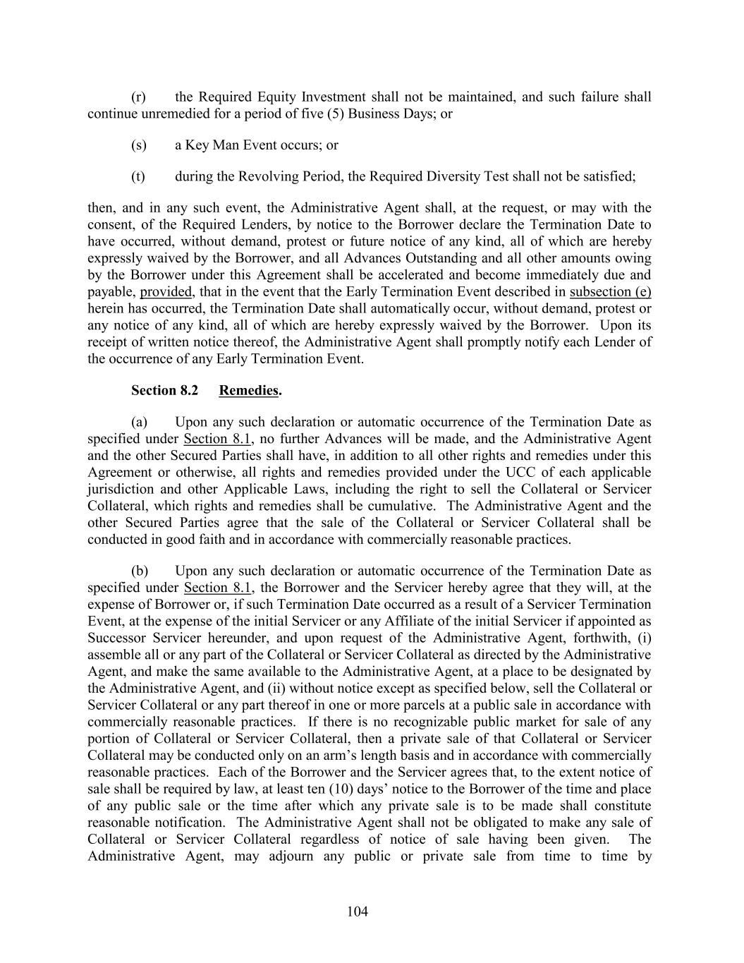 (r) the Required Equity Investment shall not be maintained, and such failure shall continue unremedied for a period of five (5) Business Days; or (s) a Key Man Event occurs; or (t) during the Revolving Period, the Required Diversity Test shall not be satisfied; then, and in any such event, the Administrative Agent shall, at the request, or may with the consent, of the Required Lenders, by notice to the Borrower declare the Termination Date to have occurred, without demand, protest or future notice of any kind, all of which are hereby expressly waived by the Borrower, and all Advances Outstanding and all other amounts owing by the Borrower under this Agreement shall be accelerated and become immediately due and payable, provided, that in the event that the Early Termination Event described in subsection (e) herein has occurred, the Termination Date shall automatically occur, without demand, protest or any notice of any kind, all of which are hereby expressly waived by the Borrower. Upon its receipt of written notice thereof, the Administrative Agent shall promptly notify each Lender of the occurrence of any Early Termination Event. Section 8.2 Remedies. (a) Upon any such declaration or automatic occurrence of the Termination Date as specified under Section 8.1, no further Advances will be made, and the Administrative Agent and the other Secured Parties shall have, in addition to all other rights and remedies under this Agreement or otherwise, all rights and remedies provided under the UCC of each applicable jurisdiction and other Applicable Laws, including the right to sell the Collateral or Servicer Collateral, which rights and remedies shall be cumulative. The Administrative Agent and the other Secured Parties agree that the sale of the Collateral or Servicer Collateral shall be conducted in good faith and in accordance with commercially reasonable practices. (b) Upon any such declaration or automatic occurrence of the Termination Date as specified under Section 8.1, the Borrower and the Servicer hereby agree that they will, at the expense of Borrower or, if such Termination Date occurred as a result of a Servicer Termination Event, at the expense of the initial Servicer or any Affiliate of the initial Servicer if appointed as Successor Servicer hereunder, and upon request of the Administrative Agent, forthwith, (i) assemble all or any part of the Collateral or Servicer Collateral as directed by the Administrative Agent, and make the same available to the Administrative Agent, at a place to be designated by the Administrative Agent, and (ii) without notice except as specified below, sell the Collateral or Servicer Collateral or any part thereof in one or more parcels at a public sale in accordance with commercially reasonable practices. If there is no recognizable public market for sale of any portion of Collateral or Servicer Collateral, then a private sale of that Collateral or Servicer Collateral may be conducted only on an arm’s length basis and in accordance with commercially reasonable practices. Each of the Borrower and the Servicer agrees that, to the extent notice of sale shall be required by law, at least ten (10) days’ notice to the Borrower of the time and place of any public sale or the time after which any private sale is to be made shall constitute reasonable notification. The Administrative Agent shall not be obligated to make any sale of Collateral or Servicer Collateral regardless of notice of sale having been given. The Administrative Agent, may adjourn any public or private sale from time to time by 104