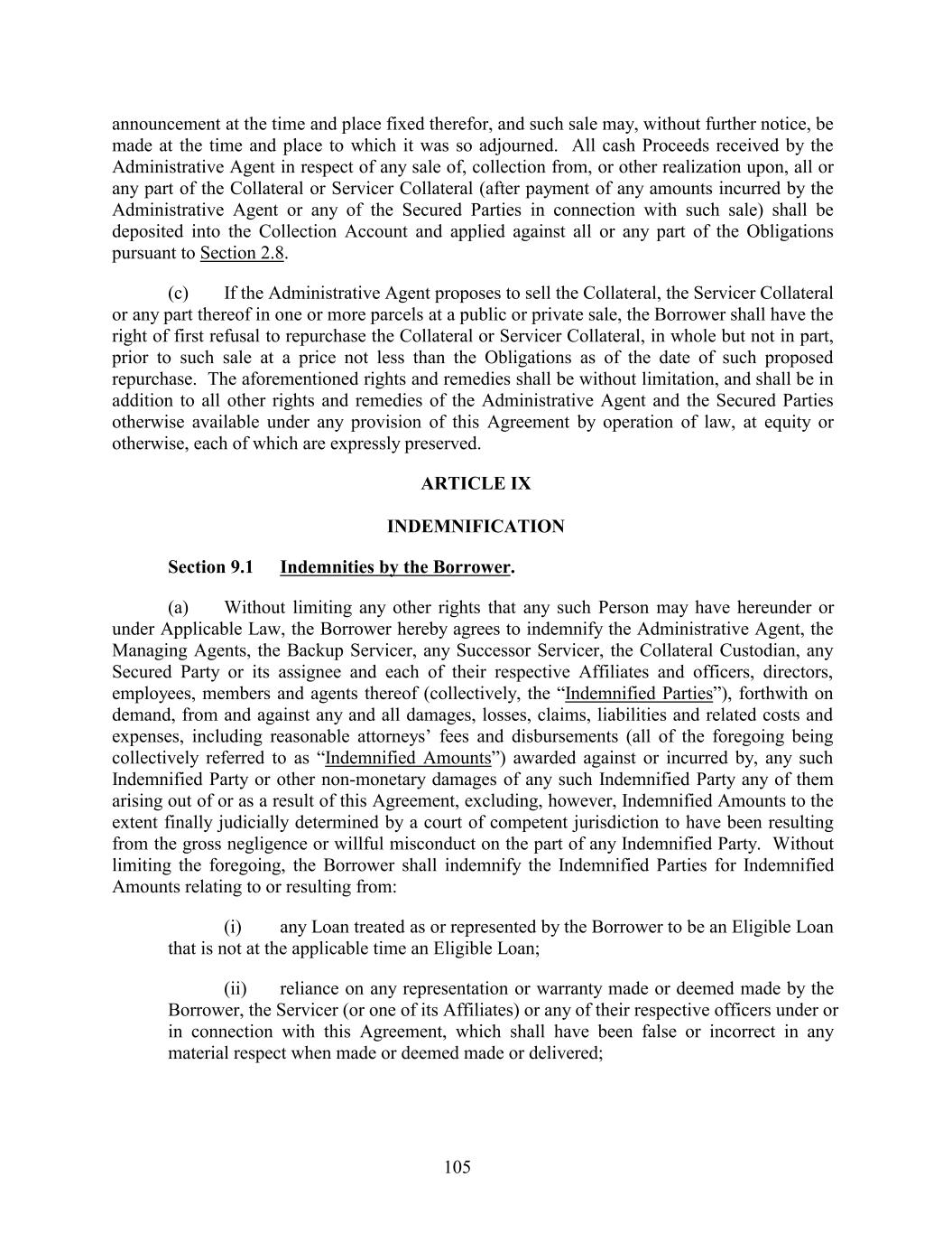 announcement at the time and place fixed therefor, and such sale may, without further notice, be made at the time and place to which it was so adjourned. All cash Proceeds received by the Administrative Agent in respect of any sale of, collection from, or other realization upon, all or any part of the Collateral or Servicer Collateral (after payment of any amounts incurred by the Administrative Agent or any of the Secured Parties in connection with such sale) shall be deposited into the Collection Account and applied against all or any part of the Obligations pursuant to Section 2.8. (c) If the Administrative Agent proposes to sell the Collateral, the Servicer Collateral or any part thereof in one or more parcels at a public or private sale, the Borrower shall have the right of first refusal to repurchase the Collateral or Servicer Collateral, in whole but not in part, prior to such sale at a price not less than the Obligations as of the date of such proposed repurchase. The aforementioned rights and remedies shall be without limitation, and shall be in addition to all other rights and remedies of the Administrative Agent and the Secured Parties otherwise available under any provision of this Agreement by operation of law, at equity or otherwise, each of which are expressly preserved. ARTICLE IX INDEMNIFICATION Section 9.1 Indemnities by the Borrower. (a) Without limiting any other rights that any such Person may have hereunder or under Applicable Law, the Borrower hereby agrees to indemnify the Administrative Agent, the Managing Agents, the Backup Servicer, any Successor Servicer, the Collateral Custodian, any Secured Party or its assignee and each of their respective Affiliates and officers, directors, employees, members and agents thereof (collectively, the “Indemnified Parties”), forthwith on demand, from and against any and all damages, losses, claims, liabilities and related costs and expenses, including reasonable attorneys’ fees and disbursements (all of the foregoing being collectively referred to as “Indemnified Amounts”) awarded against or incurred by, any such Indemnified Party or other non-monetary damages of any such Indemnified Party any of them arising out of or as a result of this Agreement, excluding, however, Indemnified Amounts to the extent finally judicially determined by a court of competent jurisdiction to have been resulting from the gross negligence or willful misconduct on the part of any Indemnified Party. Without limiting the foregoing, the Borrower shall indemnify the Indemnified Parties for Indemnified Amounts relating to or resulting from: (i) any Loan treated as or represented by the Borrower to be an Eligible Loan that is not at the applicable time an Eligible Loan; (ii) reliance on any representation or warranty made or deemed made by the Borrower, the Servicer (or one of its Affiliates) or any of their respective officers under or in connection with this Agreement, which shall have been false or incorrect in any material respect when made or deemed made or delivered; 105