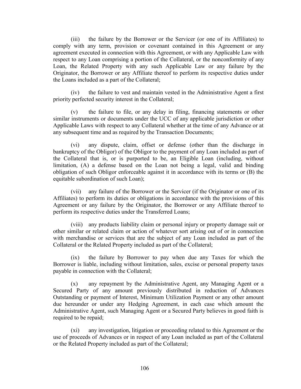 (iii) the failure by the Borrower or the Servicer (or one of its Affiliates) to comply with any term, provision or covenant contained in this Agreement or any agreement executed in connection with this Agreement, or with any Applicable Law with respect to any Loan comprising a portion of the Collateral, or the nonconformity of any Loan, the Related Property with any such Applicable Law or any failure by the Originator, the Borrower or any Affiliate thereof to perform its respective duties under the Loans included as a part of the Collateral; (iv) the failure to vest and maintain vested in the Administrative Agent a first priority perfected security interest in the Collateral; (v) the failure to file, or any delay in filing, financing statements or other similar instruments or documents under the UCC of any applicable jurisdiction or other Applicable Laws with respect to any Collateral whether at the time of any Advance or at any subsequent time and as required by the Transaction Documents; (vi) any dispute, claim, offset or defense (other than the discharge in bankruptcy of the Obligor) of the Obligor to the payment of any Loan included as part of the Collateral that is, or is purported to be, an Eligible Loan (including, without limitation, (A) a defense based on the Loan not being a legal, valid and binding obligation of such Obligor enforceable against it in accordance with its terms or (B) the equitable subordination of such Loan); (vii) any failure of the Borrower or the Servicer (if the Originator or one of its Affiliates) to perform its duties or obligations in accordance with the provisions of this Agreement or any failure by the Originator, the Borrower or any Affiliate thereof to perform its respective duties under the Transferred Loans; (viii) any products liability claim or personal injury or property damage suit or other similar or related claim or action of whatever sort arising out of or in connection with merchandise or services that are the subject of any Loan included as part of the Collateral or the Related Property included as part of the Collateral; (ix) the failure by Borrower to pay when due any Taxes for which the Borrower is liable, including without limitation, sales, excise or personal property taxes payable in connection with the Collateral; (x) any repayment by the Administrative Agent, any Managing Agent or a Secured Party of any amount previously distributed in reduction of Advances Outstanding or payment of Interest, Minimum Utilization Payment or any other amount due hereunder or under any Hedging Agreement, in each case which amount the Administrative Agent, such Managing Agent or a Secured Party believes in good faith is required to be repaid; (xi) any investigation, litigation or proceeding related to this Agreement or the use of proceeds of Advances or in respect of any Loan included as part of the Collateral or the Related Property included as part of the Collateral; 106