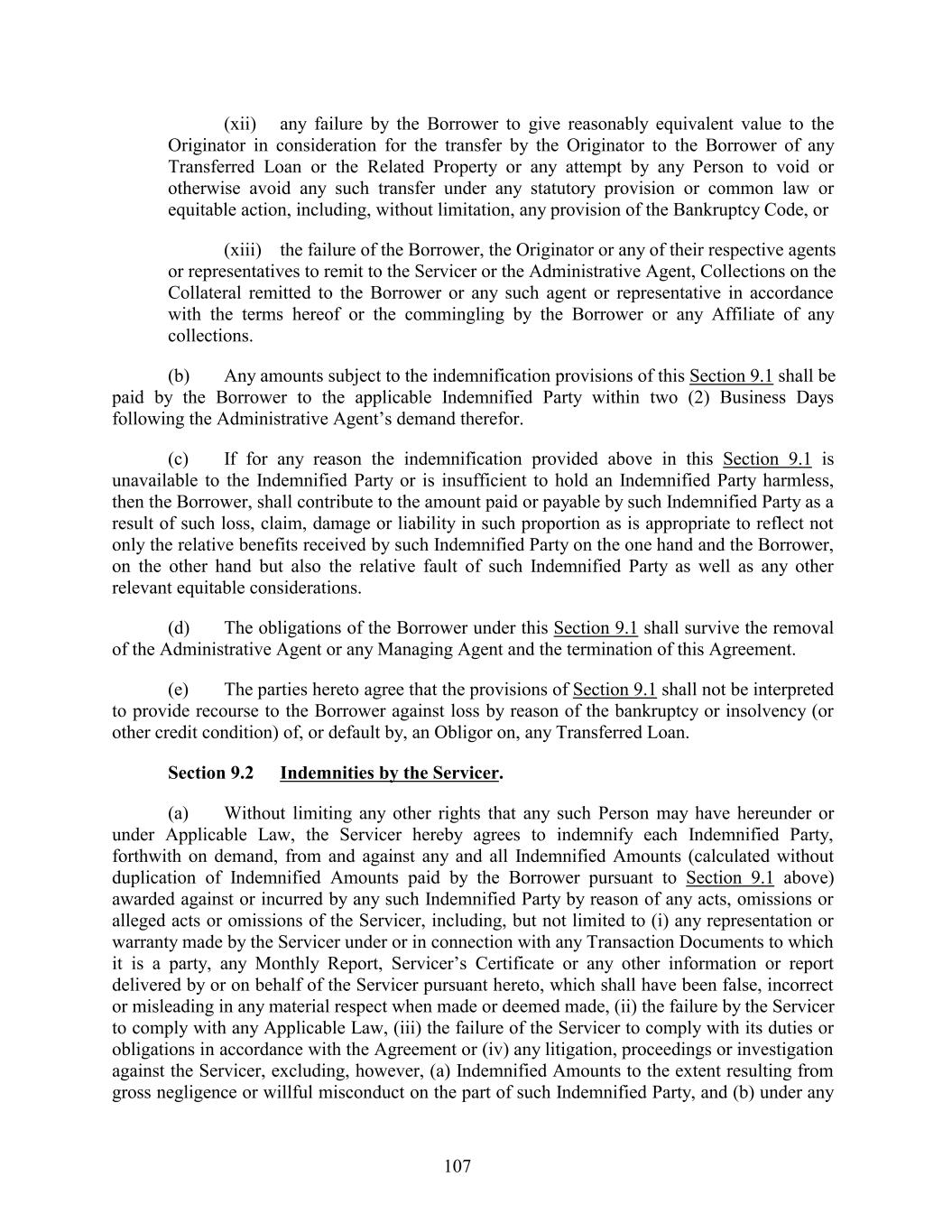 (xii) any failure by the Borrower to give reasonably equivalent value to the Originator in consideration for the transfer by the Originator to the Borrower of any Transferred Loan or the Related Property or any attempt by any Person to void or otherwise avoid any such transfer under any statutory provision or common law or equitable action, including, without limitation, any provision of the Bankruptcy Code, or (xiii) the failure of the Borrower, the Originator or any of their respective agents or representatives to remit to the Servicer or the Administrative Agent, Collections on the Collateral remitted to the Borrower or any such agent or representative in accordance with the terms hereof or the commingling by the Borrower or any Affiliate of any collections. (b) Any amounts subject to the indemnification provisions of this Section 9.1 shall be paid by the Borrower to the applicable Indemnified Party within two (2) Business Days following the Administrative Agent’s demand therefor. (c) If for any reason the indemnification provided above in this Section 9.1 is unavailable to the Indemnified Party or is insufficient to hold an Indemnified Party harmless, then the Borrower, shall contribute to the amount paid or payable by such Indemnified Party as a result of such loss, claim, damage or liability in such proportion as is appropriate to reflect not only the relative benefits received by such Indemnified Party on the one hand and the Borrower, on the other hand but also the relative fault of such Indemnified Party as well as any other relevant equitable considerations. (d) The obligations of the Borrower under this Section 9.1 shall survive the removal of the Administrative Agent or any Managing Agent and the termination of this Agreement. (e) The parties hereto agree that the provisions of Section 9.1 shall not be interpreted to provide recourse to the Borrower against loss by reason of the bankruptcy or insolvency (or other credit condition) of, or default by, an Obligor on, any Transferred Loan. Section 9.2 Indemnities by the Servicer. (a) Without limiting any other rights that any such Person may have hereunder or under Applicable Law, the Servicer hereby agrees to indemnify each Indemnified Party, forthwith on demand, from and against any and all Indemnified Amounts (calculated without duplication of Indemnified Amounts paid by the Borrower pursuant to Section 9.1 above) awarded against or incurred by any such Indemnified Party by reason of any acts, omissions or alleged acts or omissions of the Servicer, including, but not limited to (i) any representation or warranty made by the Servicer under or in connection with any Transaction Documents to which it is a party, any Monthly Report, Servicer’s Certificate or any other information or report delivered by or on behalf of the Servicer pursuant hereto, which shall have been false, incorrect or misleading in any material respect when made or deemed made, (ii) the failure by the Servicer to comply with any Applicable Law, (iii) the failure of the Servicer to comply with its duties or obligations in accordance with the Agreement or (iv) any litigation, proceedings or investigation against the Servicer, excluding, however, (a) Indemnified Amounts to the extent resulting from gross negligence or willful misconduct on the part of such Indemnified Party, and (b) under any 107