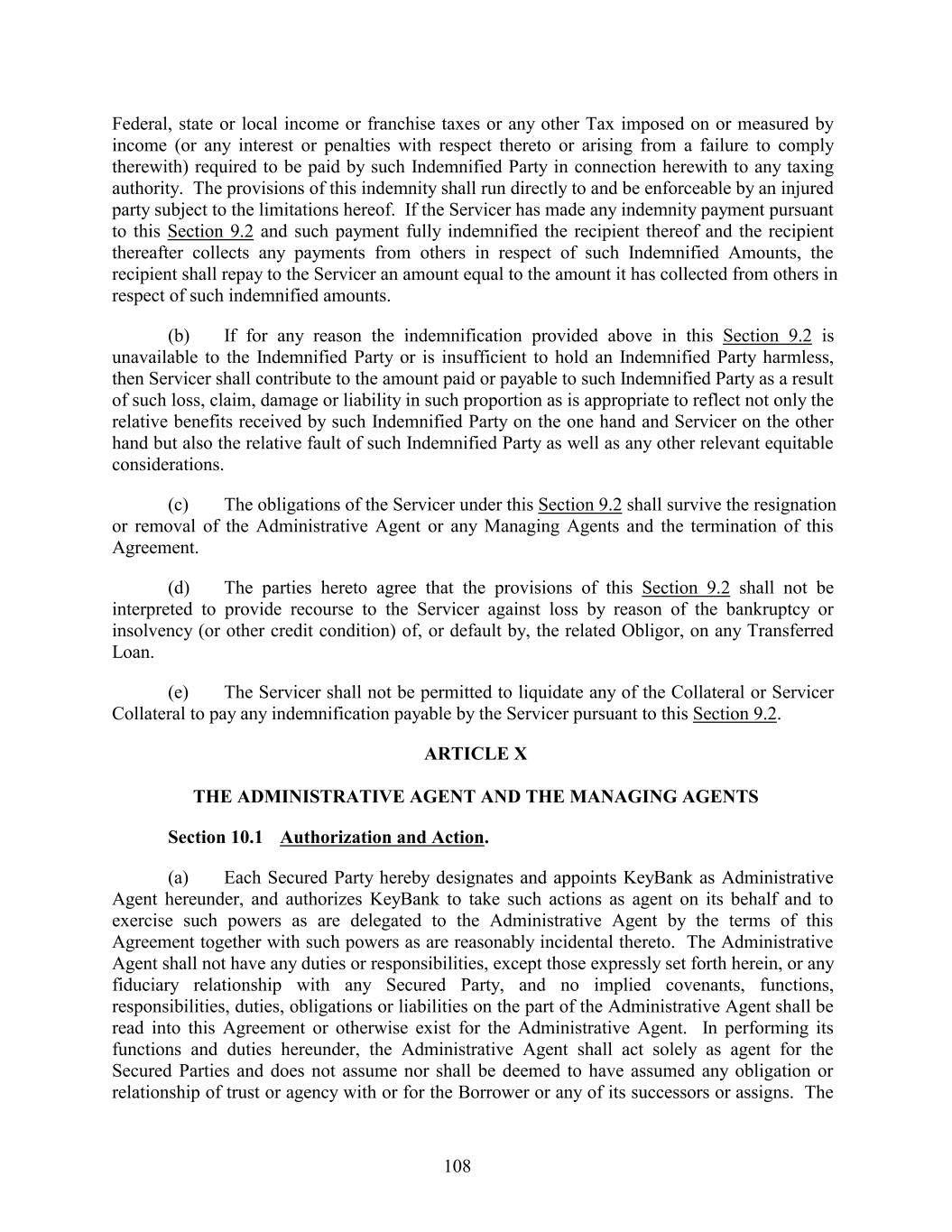 Federal, state or local income or franchise taxes or any other Tax imposed on or measured by income (or any interest or penalties with respect thereto or arising from a failure to comply therewith) required to be paid by such Indemnified Party in connection herewith to any taxing authority. The provisions of this indemnity shall run directly to and be enforceable by an injured party subject to the limitations hereof. If the Servicer has made any indemnity payment pursuant to this Section 9.2 and such payment fully indemnified the recipient thereof and the recipient thereafter collects any payments from others in respect of such Indemnified Amounts, the recipient shall repay to the Servicer an amount equal to the amount it has collected from others in respect of such indemnified amounts. (b) If for any reason the indemnification provided above in this Section 9.2 is unavailable to the Indemnified Party or is insufficient to hold an Indemnified Party harmless, then Servicer shall contribute to the amount paid or payable to such Indemnified Party as a result of such loss, claim, damage or liability in such proportion as is appropriate to reflect not only the relative benefits received by such Indemnified Party on the one hand and Servicer on the other hand but also the relative fault of such Indemnified Party as well as any other relevant equitable considerations. (c) The obligations of the Servicer under this Section 9.2 shall survive the resignation or removal of the Administrative Agent or any Managing Agents and the termination of this Agreement. (d) The parties hereto agree that the provisions of this Section 9.2 shall not be interpreted to provide recourse to the Servicer against loss by reason of the bankruptcy or insolvency (or other credit condition) of, or default by, the related Obligor, on any Transferred Loan. (e) The Servicer shall not be permitted to liquidate any of the Collateral or Servicer Collateral to pay any indemnification payable by the Servicer pursuant to this Section 9.2. ARTICLE X THE ADMINISTRATIVE AGENT AND THE MANAGING AGENTS Section 10.1 Authorization and Action. (a) Each Secured Party hereby designates and appoints KeyBank as Administrative Agent hereunder, and authorizes KeyBank to take such actions as agent on its behalf and to exercise such powers as are delegated to the Administrative Agent by the terms of this Agreement together with such powers as are reasonably incidental thereto. The Administrative Agent shall not have any duties or responsibilities, except those expressly set forth herein, or any fiduciary relationship with any Secured Party, and no implied covenants, functions, responsibilities, duties, obligations or liabilities on the part of the Administrative Agent shall be read into this Agreement or otherwise exist for the Administrative Agent. In performing its functions and duties hereunder, the Administrative Agent shall act solely as agent for the Secured Parties and does not assume nor shall be deemed to have assumed any obligation or relationship of trust or agency with or for the Borrower or any of its successors or assigns. The 108