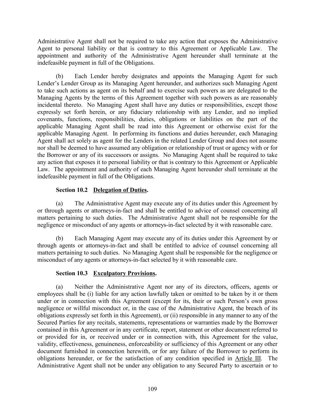 Administrative Agent shall not be required to take any action that exposes the Administrative Agent to personal liability or that is contrary to this Agreement or Applicable Law. The appointment and authority of the Administrative Agent hereunder shall terminate at the indefeasible payment in full of the Obligations. (b) Each Lender hereby designates and appoints the Managing Agent for such Lender’s Lender Group as its Managing Agent hereunder, and authorizes such Managing Agent to take such actions as agent on its behalf and to exercise such powers as are delegated to the Managing Agents by the terms of this Agreement together with such powers as are reasonably incidental thereto. No Managing Agent shall have any duties or responsibilities, except those expressly set forth herein, or any fiduciary relationship with any Lender, and no implied covenants, functions, responsibilities, duties, obligations or liabilities on the part of the applicable Managing Agent shall be read into this Agreement or otherwise exist for the applicable Managing Agent. In performing its functions and duties hereunder, each Managing Agent shall act solely as agent for the Lenders in the related Lender Group and does not assume nor shall be deemed to have assumed any obligation or relationship of trust or agency with or for the Borrower or any of its successors or assigns. No Managing Agent shall be required to take any action that exposes it to personal liability or that is contrary to this Agreement or Applicable Law. The appointment and authority of each Managing Agent hereunder shall terminate at the indefeasible payment in full of the Obligations. Section 10.2 Delegation of Duties. (a) The Administrative Agent may execute any of its duties under this Agreement by or through agents or attorneys-in-fact and shall be entitled to advice of counsel concerning all matters pertaining to such duties. The Administrative Agent shall not be responsible for the negligence or misconduct of any agents or attorneys-in-fact selected by it with reasonable care. (b) Each Managing Agent may execute any of its duties under this Agreement by or through agents or attorneys-in-fact and shall be entitled to advice of counsel concerning all matters pertaining to such duties. No Managing Agent shall be responsible for the negligence or misconduct of any agents or attorneys-in-fact selected by it with reasonable care. Section 10.3 Exculpatory Provisions. (a) Neither the Administrative Agent nor any of its directors, officers, agents or employees shall be (i) liable for any action lawfully taken or omitted to be taken by it or them under or in connection with this Agreement (except for its, their or such Person’s own gross negligence or willful misconduct or, in the case of the Administrative Agent, the breach of its obligations expressly set forth in this Agreement), or (ii) responsible in any manner to any of the Secured Parties for any recitals, statements, representations or warranties made by the Borrower contained in this Agreement or in any certificate, report, statement or other document referred to or provided for in, or received under or in connection with, this Agreement for the value, validity, effectiveness, genuineness, enforceability or sufficiency of this Agreement or any other document furnished in connection herewith, or for any failure of the Borrower to perform its obligations hereunder, or for the satisfaction of any condition specified in Article III. The Administrative Agent shall not be under any obligation to any Secured Party to ascertain or to 109