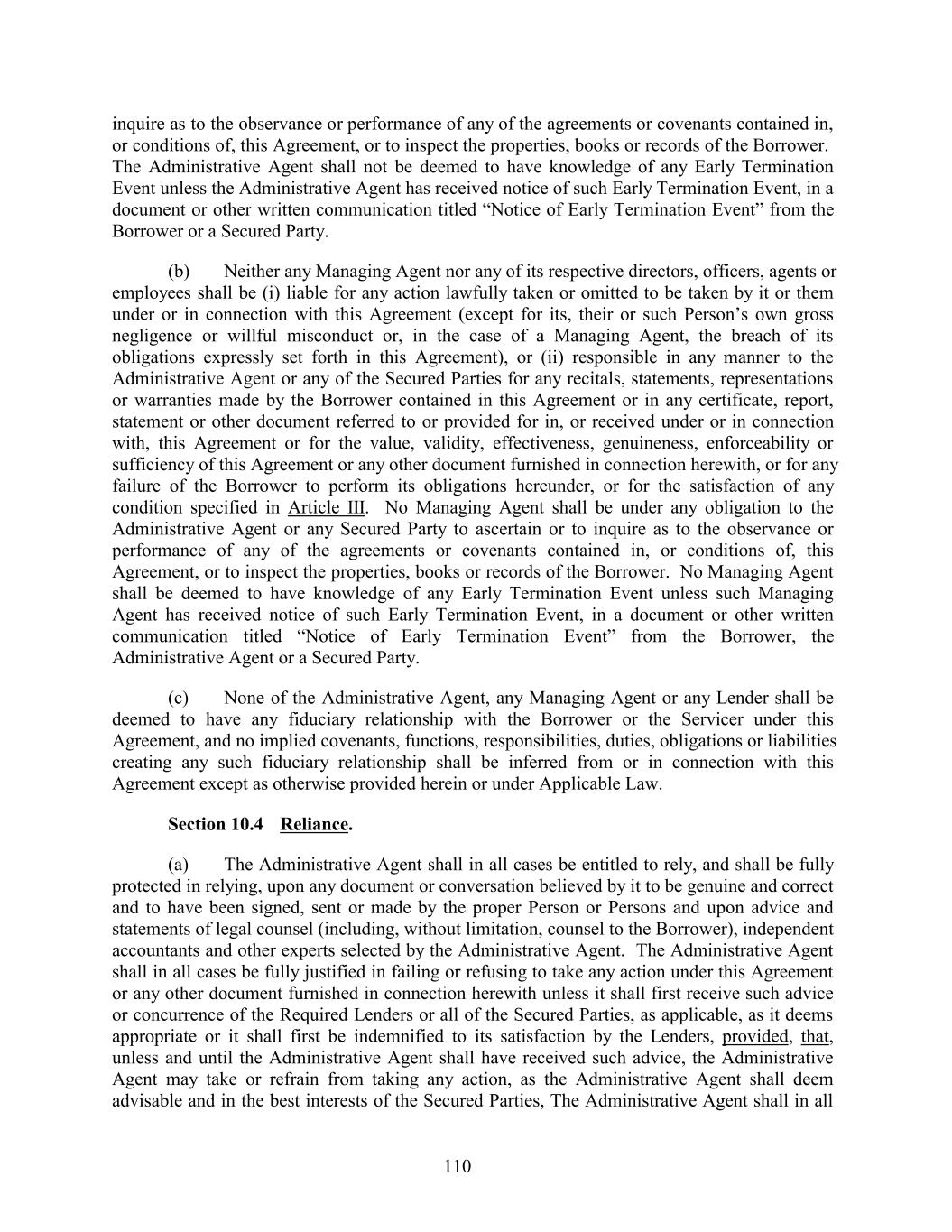 inquire as to the observance or performance of any of the agreements or covenants contained in, or conditions of, this Agreement, or to inspect the properties, books or records of the Borrower. The Administrative Agent shall not be deemed to have knowledge of any Early Termination Event unless the Administrative Agent has received notice of such Early Termination Event, in a document or other written communication titled “Notice of Early Termination Event” from the Borrower or a Secured Party. (b) Neither any Managing Agent nor any of its respective directors, officers, agents or employees shall be (i) liable for any action lawfully taken or omitted to be taken by it or them under or in connection with this Agreement (except for its, their or such Person’s own gross negligence or willful misconduct or, in the case of a Managing Agent, the breach of its obligations expressly set forth in this Agreement), or (ii) responsible in any manner to the Administrative Agent or any of the Secured Parties for any recitals, statements, representations or warranties made by the Borrower contained in this Agreement or in any certificate, report, statement or other document referred to or provided for in, or received under or in connection with, this Agreement or for the value, validity, effectiveness, genuineness, enforceability or sufficiency of this Agreement or any other document furnished in connection herewith, or for any failure of the Borrower to perform its obligations hereunder, or for the satisfaction of any condition specified in Article III. No Managing Agent shall be under any obligation to the Administrative Agent or any Secured Party to ascertain or to inquire as to the observance or performance of any of the agreements or covenants contained in, or conditions of, this Agreement, or to inspect the properties, books or records of the Borrower. No Managing Agent shall be deemed to have knowledge of any Early Termination Event unless such Managing Agent has received notice of such Early Termination Event, in a document or other written communication titled “Notice of Early Termination Event” from the Borrower, the Administrative Agent or a Secured Party. (c) None of the Administrative Agent, any Managing Agent or any Lender shall be deemed to have any fiduciary relationship with the Borrower or the Servicer under this Agreement, and no implied covenants, functions, responsibilities, duties, obligations or liabilities creating any such fiduciary relationship shall be inferred from or in connection with this Agreement except as otherwise provided herein or under Applicable Law. Section 10.4 Reliance. (a) The Administrative Agent shall in all cases be entitled to rely, and shall be fully protected in relying, upon any document or conversation believed by it to be genuine and correct and to have been signed, sent or made by the proper Person or Persons and upon advice and statements of legal counsel (including, without limitation, counsel to the Borrower), independent accountants and other experts selected by the Administrative Agent. The Administrative Agent shall in all cases be fully justified in failing or refusing to take any action under this Agreement or any other document furnished in connection herewith unless it shall first receive such advice or concurrence of the Required Lenders or all of the Secured Parties, as applicable, as it deems appropriate or it shall first be indemnified to its satisfaction by the Lenders, provided, that, unless and until the Administrative Agent shall have received such advice, the Administrative Agent may take or refrain from taking any action, as the Administrative Agent shall deem advisable and in the best interests of the Secured Parties, The Administrative Agent shall in all 110