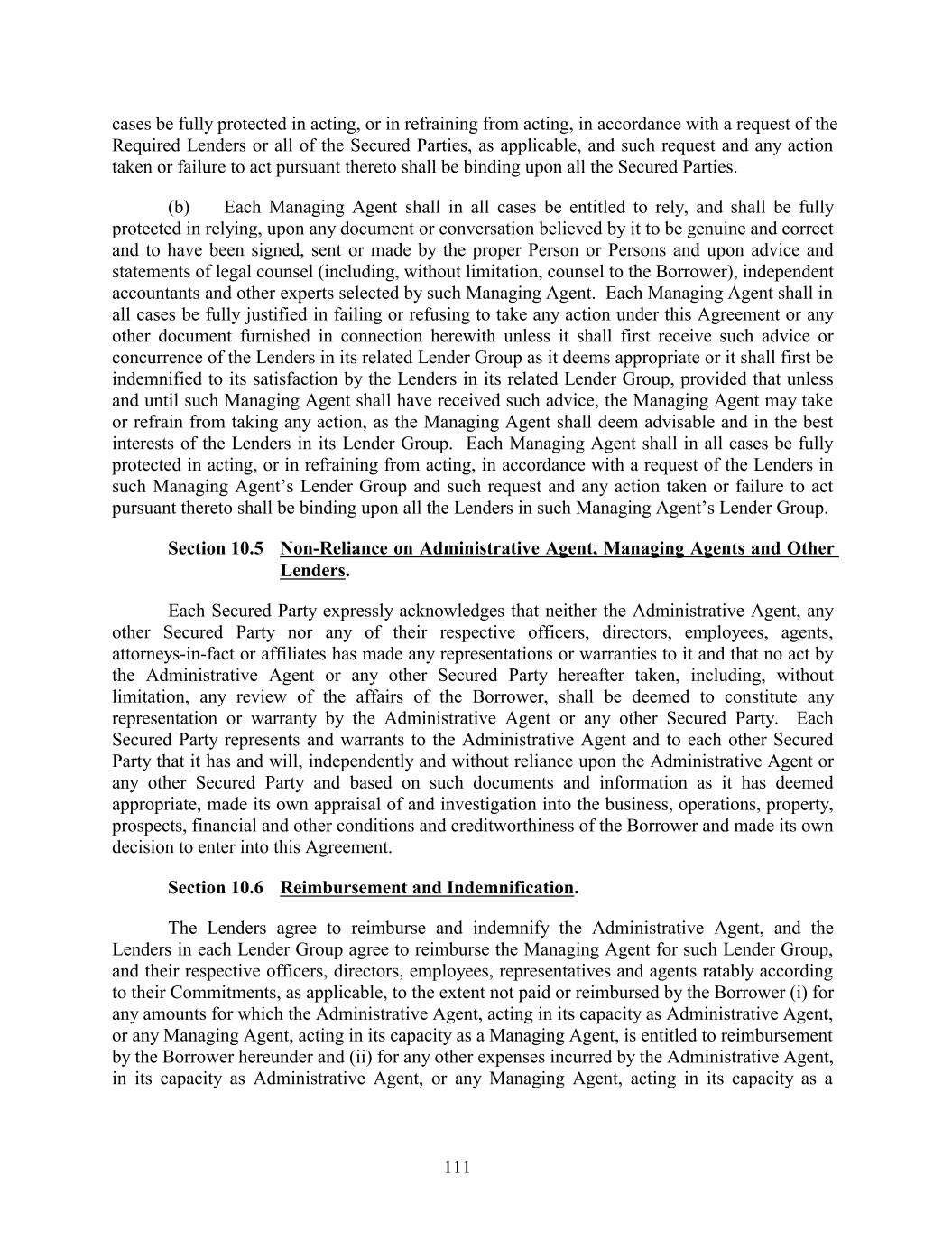 cases be fully protected in acting, or in refraining from acting, in accordance with a request of the Required Lenders or all of the Secured Parties, as applicable, and such request and any action taken or failure to act pursuant thereto shall be binding upon all the Secured Parties. (b) Each Managing Agent shall in all cases be entitled to rely, and shall be fully protected in relying, upon any document or conversation believed by it to be genuine and correct and to have been signed, sent or made by the proper Person or Persons and upon advice and statements of legal counsel (including, without limitation, counsel to the Borrower), independent accountants and other experts selected by such Managing Agent. Each Managing Agent shall in all cases be fully justified in failing or refusing to take any action under this Agreement or any other document furnished in connection herewith unless it shall first receive such advice or concurrence of the Lenders in its related Lender Group as it deems appropriate or it shall first be indemnified to its satisfaction by the Lenders in its related Lender Group, provided that unless and until such Managing Agent shall have received such advice, the Managing Agent may take or refrain from taking any action, as the Managing Agent shall deem advisable and in the best interests of the Lenders in its Lender Group. Each Managing Agent shall in all cases be fully protected in acting, or in refraining from acting, in accordance with a request of the Lenders in such Managing Agent’s Lender Group and such request and any action taken or failure to act pursuant thereto shall be binding upon all the Lenders in such Managing Agent’s Lender Group. Section 10.5 Non-Reliance on Administrative Agent, Managing Agents and Other Lenders. Each Secured Party expressly acknowledges that neither the Administrative Agent, any other Secured Party nor any of their respective officers, directors, employees, agents, attorneys-in-fact or affiliates has made any representations or warranties to it and that no act by the Administrative Agent or any other Secured Party hereafter taken, including, without limitation, any review of the affairs of the Borrower, shall be deemed to constitute any representation or warranty by the Administrative Agent or any other Secured Party. Each Secured Party represents and warrants to the Administrative Agent and to each other Secured Party that it has and will, independently and without reliance upon the Administrative Agent or any other Secured Party and based on such documents and information as it has deemed appropriate, made its own appraisal of and investigation into the business, operations, property, prospects, financial and other conditions and creditworthiness of the Borrower and made its own decision to enter into this Agreement. Section 10.6 Reimbursement and Indemnification. The Lenders agree to reimburse and indemnify the Administrative Agent, and the Lenders in each Lender Group agree to reimburse the Managing Agent for such Lender Group, and their respective officers, directors, employees, representatives and agents ratably according to their Commitments, as applicable, to the extent not paid or reimbursed by the Borrower (i) for any amounts for which the Administrative Agent, acting in its capacity as Administrative Agent, or any Managing Agent, acting in its capacity as a Managing Agent, is entitled to reimbursement by the Borrower hereunder and (ii) for any other expenses incurred by the Administrative Agent, in its capacity as Administrative Agent, or any Managing Agent, acting in its capacity as a 111