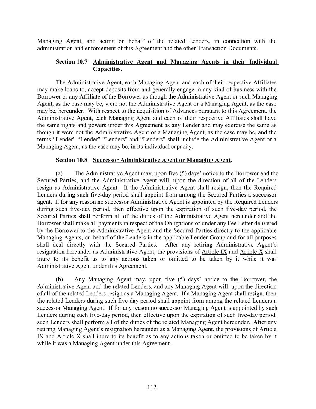 Managing Agent, and acting on behalf of the related Lenders, in connection with the administration and enforcement of this Agreement and the other Transaction Documents. Section 10.7 Administrative Agent and Managing Agents in their Individual Capacities. The Administrative Agent, each Managing Agent and each of their respective Affiliates may make loans to, accept deposits from and generally engage in any kind of business with the Borrower or any Affiliate of the Borrower as though the Administrative Agent or such Managing Agent, as the case may be, were not the Administrative Agent or a Managing Agent, as the case may be, hereunder. With respect to the acquisition of Advances pursuant to this Agreement, the Administrative Agent, each Managing Agent and each of their respective Affiliates shall have the same rights and powers under this Agreement as any Lender and may exercise the same as though it were not the Administrative Agent or a Managing Agent, as the case may be, and the terms “Lender” “Lender” “Lenders” and “Lenders” shall include the Administrative Agent or a Managing Agent, as the case may be, in its individual capacity. Section 10.8 Successor Administrative Agent or Managing Agent. (a) The Administrative Agent may, upon five (5) days’ notice to the Borrower and the Secured Parties, and the Administrative Agent will, upon the direction of all of the Lenders resign as Administrative Agent. If the Administrative Agent shall resign, then the Required Lenders during such five-day period shall appoint from among the Secured Parties a successor agent. If for any reason no successor Administrative Agent is appointed by the Required Lenders during such five-day period, then effective upon the expiration of such five-day period, the Secured Parties shall perform all of the duties of the Administrative Agent hereunder and the Borrower shall make all payments in respect of the Obligations or under any Fee Letter delivered by the Borrower to the Administrative Agent and the Secured Parties directly to the applicable Managing Agents, on behalf of the Lenders in the applicable Lender Group and for all purposes shall deal directly with the Secured Parties. After any retiring Administrative Agent’s resignation hereunder as Administrative Agent, the provisions of Article IX and Article X shall inure to its benefit as to any actions taken or omitted to be taken by it while it was Administrative Agent under this Agreement. (b) Any Managing Agent may, upon five (5) days’ notice to the Borrower, the Administrative Agent and the related Lenders, and any Managing Agent will, upon the direction of all of the related Lenders resign as a Managing Agent. If a Managing Agent shall resign, then the related Lenders during such five-day period shall appoint from among the related Lenders a successor Managing Agent. If for any reason no successor Managing Agent is appointed by such Lenders during such five-day period, then effective upon the expiration of such five-day period, such Lenders shall perform all of the duties of the related Managing Agent hereunder. After any retiring Managing Agent’s resignation hereunder as a Managing Agent, the provisions of Article IX and Article X shall inure to its benefit as to any actions taken or omitted to be taken by it while it was a Managing Agent under this Agreement. 112