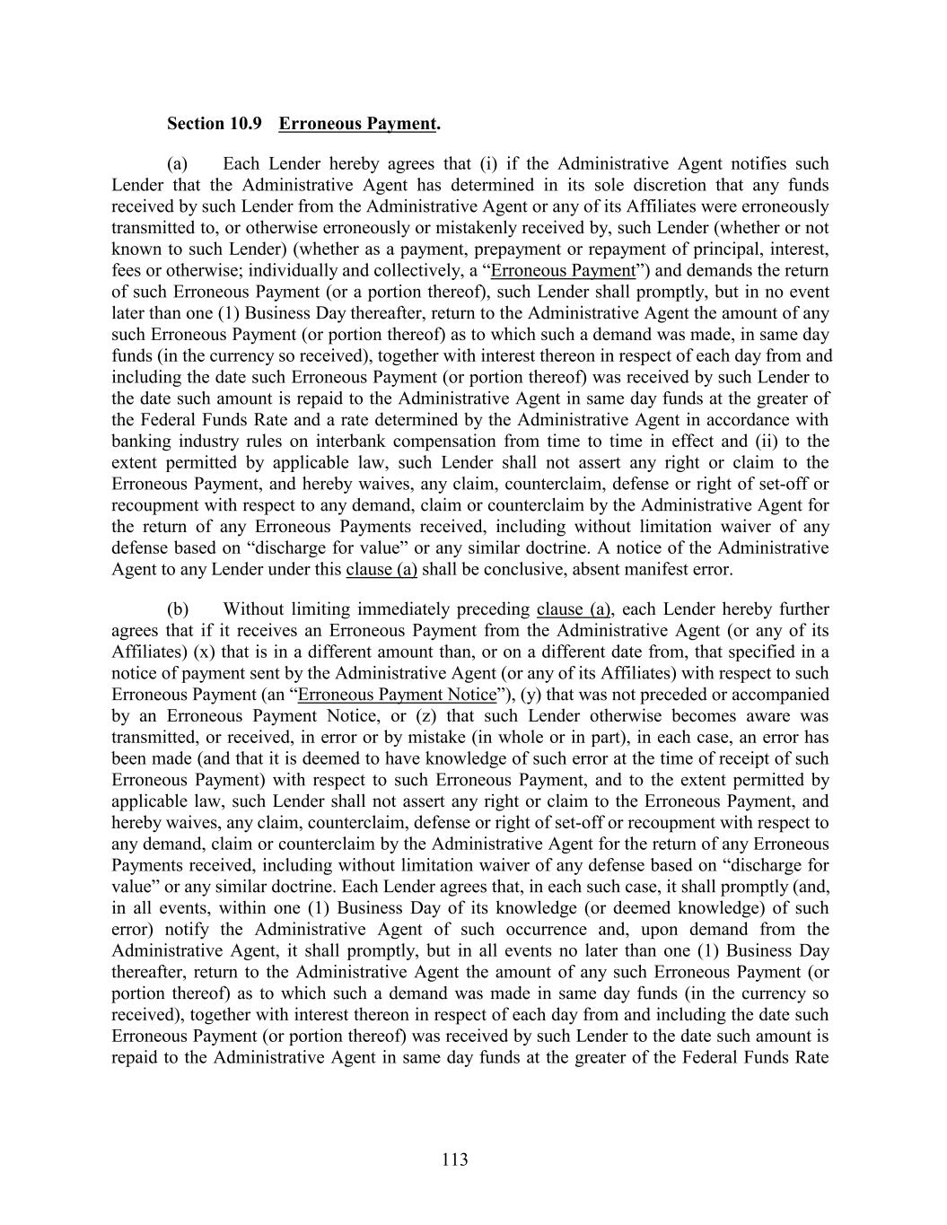 Section 10.9 Erroneous Payment. (a) Each Lender hereby agrees that (i) if the Administrative Agent notifies such Lender that the Administrative Agent has determined in its sole discretion that any funds received by such Lender from the Administrative Agent or any of its Affiliates were erroneously transmitted to, or otherwise erroneously or mistakenly received by, such Lender (whether or not known to such Lender) (whether as a payment, prepayment or repayment of principal, interest, fees or otherwise; individually and collectively, a “Erroneous Payment”) and demands the return of such Erroneous Payment (or a portion thereof), such Lender shall promptly, but in no event later than one (1) Business Day thereafter, return to the Administrative Agent the amount of any such Erroneous Payment (or portion thereof) as to which such a demand was made, in same day funds (in the currency so received), together with interest thereon in respect of each day from and including the date such Erroneous Payment (or portion thereof) was received by such Lender to the date such amount is repaid to the Administrative Agent in same day funds at the greater of the Federal Funds Rate and a rate determined by the Administrative Agent in accordance with banking industry rules on interbank compensation from time to time in effect and (ii) to the extent permitted by applicable law, such Lender shall not assert any right or claim to the Erroneous Payment, and hereby waives, any claim, counterclaim, defense or right of set-off or recoupment with respect to any demand, claim or counterclaim by the Administrative Agent for the return of any Erroneous Payments received, including without limitation waiver of any defense based on “discharge for value” or any similar doctrine. A notice of the Administrative Agent to any Lender under this clause (a) shall be conclusive, absent manifest error. (b) Without limiting immediately preceding clause (a), each Lender hereby further agrees that if it receives an Erroneous Payment from the Administrative Agent (or any of its Affiliates) (x) that is in a different amount than, or on a different date from, that specified in a notice of payment sent by the Administrative Agent (or any of its Affiliates) with respect to such Erroneous Payment (an “Erroneous Payment Notice”), (y) that was not preceded or accompanied by an Erroneous Payment Notice, or (z) that such Lender otherwise becomes aware was transmitted, or received, in error or by mistake (in whole or in part), in each case, an error has been made (and that it is deemed to have knowledge of such error at the time of receipt of such Erroneous Payment) with respect to such Erroneous Payment, and to the extent permitted by applicable law, such Lender shall not assert any right or claim to the Erroneous Payment, and hereby waives, any claim, counterclaim, defense or right of set-off or recoupment with respect to any demand, claim or counterclaim by the Administrative Agent for the return of any Erroneous Payments received, including without limitation waiver of any defense based on “discharge for value” or any similar doctrine. Each Lender agrees that, in each such case, it shall promptly (and, in all events, within one (1) Business Day of its knowledge (or deemed knowledge) of such error) notify the Administrative Agent of such occurrence and, upon demand from the Administrative Agent, it shall promptly, but in all events no later than one (1) Business Day thereafter, return to the Administrative Agent the amount of any such Erroneous Payment (or portion thereof) as to which such a demand was made in same day funds (in the currency so received), together with interest thereon in respect of each day from and including the date such Erroneous Payment (or portion thereof) was received by such Lender to the date such amount is repaid to the Administrative Agent in same day funds at the greater of the Federal Funds Rate 113