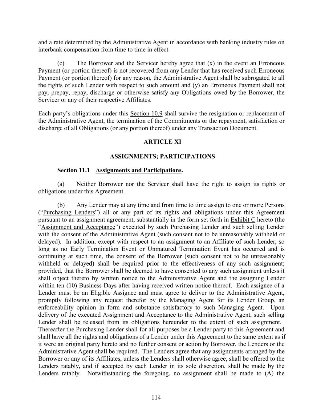 and a rate determined by the Administrative Agent in accordance with banking industry rules on interbank compensation from time to time in effect. (c) The Borrower and the Servicer hereby agree that (x) in the event an Erroneous Payment (or portion thereof) is not recovered from any Lender that has received such Erroneous Payment (or portion thereof) for any reason, the Administrative Agent shall be subrogated to all the rights of such Lender with respect to such amount and (y) an Erroneous Payment shall not pay, prepay, repay, discharge or otherwise satisfy any Obligations owed by the Borrower, the Servicer or any of their respective Affiliates. Each party’s obligations under this Section 10.9 shall survive the resignation or replacement of the Administrative Agent, the termination of the Commitments or the repayment, satisfaction or discharge of all Obligations (or any portion thereof) under any Transaction Document. ARTICLE XI ASSIGNMENTS; PARTICIPATIONS Section 11.1 Assignments and Participations. (a) Neither Borrower nor the Servicer shall have the right to assign its rights or obligations under this Agreement. (b) Any Lender may at any time and from time to time assign to one or more Persons (“Purchasing Lenders”) all or any part of its rights and obligations under this Agreement pursuant to an assignment agreement, substantially in the form set forth in Exhibit C hereto (the “Assignment and Acceptance”) executed by such Purchasing Lender and such selling Lender with the consent of the Administrative Agent (such consent not to be unreasonably withheld or delayed). In addition, except with respect to an assignment to an Affiliate of such Lender, so long as no Early Termination Event or Unmatured Termination Event has occurred and is continuing at such time, the consent of the Borrower (such consent not to be unreasonably withheld or delayed) shall be required prior to the effectiveness of any such assignment; provided, that the Borrower shall be deemed to have consented to any such assignment unless it shall object thereto by written notice to the Administrative Agent and the assigning Lender within ten (10) Business Days after having received written notice thereof. Each assignee of a Lender must be an Eligible Assignee and must agree to deliver to the Administrative Agent, promptly following any request therefor by the Managing Agent for its Lender Group, an enforceability opinion in form and substance satisfactory to such Managing Agent. Upon delivery of the executed Assignment and Acceptance to the Administrative Agent, such selling Lender shall be released from its obligations hereunder to the extent of such assignment. Thereafter the Purchasing Lender shall for all purposes be a Lender party to this Agreement and shall have all the rights and obligations of a Lender under this Agreement to the same extent as if it were an original party hereto and no further consent or action by Borrower, the Lenders or the Administrative Agent shall be required. The Lenders agree that any assignments arranged by the Borrower or any of its Affiliates, unless the Lenders shall otherwise agree, shall be offered to the Lenders ratably, and if accepted by each Lender in its sole discretion, shall be made by the Lenders ratably. Notwithstanding the foregoing, no assignment shall be made to (A) the 114