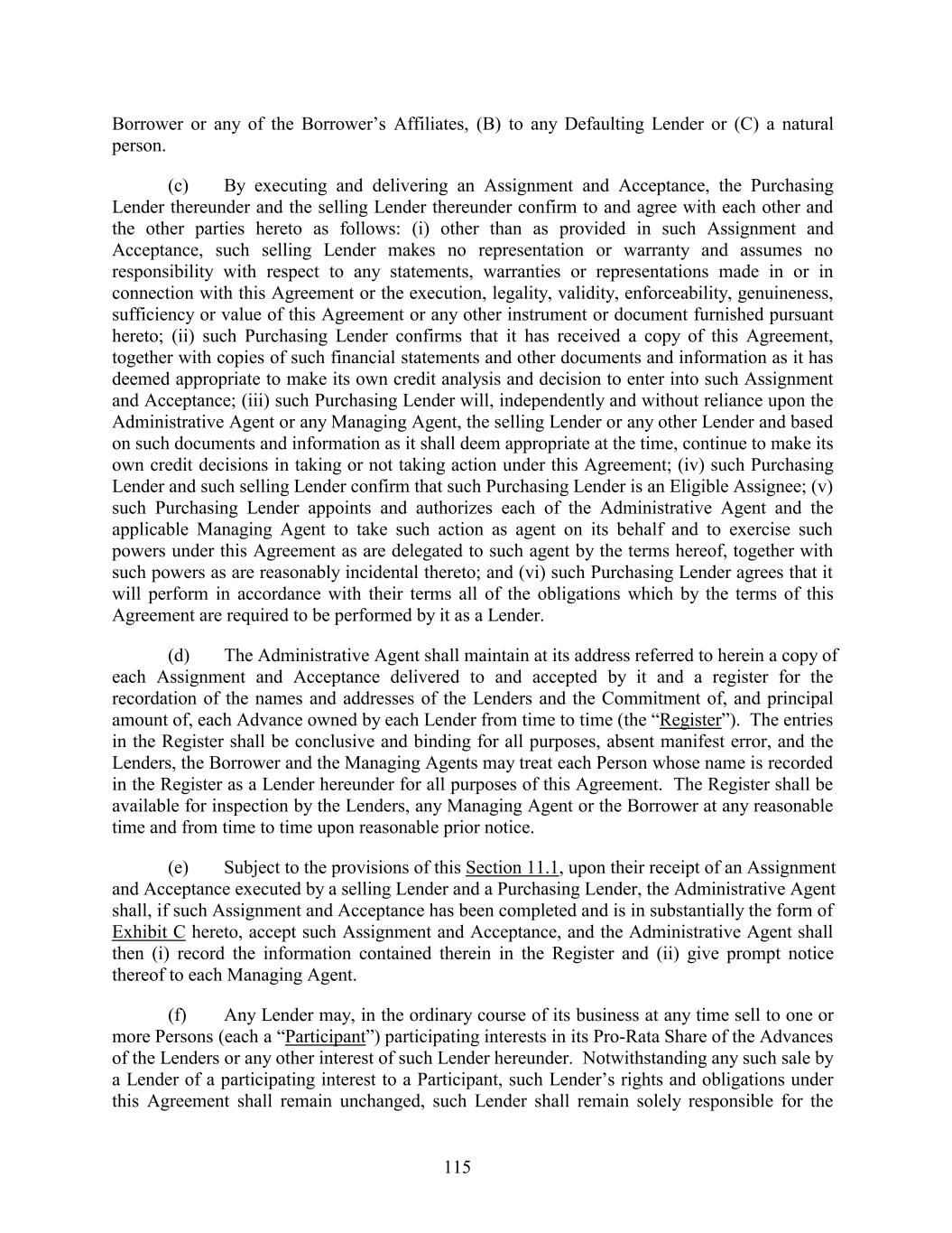 Borrower or any of the Borrower’s Affiliates, (B) to any Defaulting Lender or (C) a natural person. (c) By executing and delivering an Assignment and Acceptance, the Purchasing Lender thereunder and the selling Lender thereunder confirm to and agree with each other and the other parties hereto as follows: (i) other than as provided in such Assignment and Acceptance, such selling Lender makes no representation or warranty and assumes no responsibility with respect to any statements, warranties or representations made in or in connection with this Agreement or the execution, legality, validity, enforceability, genuineness, sufficiency or value of this Agreement or any other instrument or document furnished pursuant hereto; (ii) such Purchasing Lender confirms that it has received a copy of this Agreement, together with copies of such financial statements and other documents and information as it has deemed appropriate to make its own credit analysis and decision to enter into such Assignment and Acceptance; (iii) such Purchasing Lender will, independently and without reliance upon the Administrative Agent or any Managing Agent, the selling Lender or any other Lender and based on such documents and information as it shall deem appropriate at the time, continue to make its own credit decisions in taking or not taking action under this Agreement; (iv) such Purchasing Lender and such selling Lender confirm that such Purchasing Lender is an Eligible Assignee; (v) such Purchasing Lender appoints and authorizes each of the Administrative Agent and the applicable Managing Agent to take such action as agent on its behalf and to exercise such powers under this Agreement as are delegated to such agent by the terms hereof, together with such powers as are reasonably incidental thereto; and (vi) such Purchasing Lender agrees that it will perform in accordance with their terms all of the obligations which by the terms of this Agreement are required to be performed by it as a Lender. (d) The Administrative Agent shall maintain at its address referred to herein a copy of each Assignment and Acceptance delivered to and accepted by it and a register for the recordation of the names and addresses of the Lenders and the Commitment of, and principal amount of, each Advance owned by each Lender from time to time (the “Register”). The entries in the Register shall be conclusive and binding for all purposes, absent manifest error, and the Lenders, the Borrower and the Managing Agents may treat each Person whose name is recorded in the Register as a Lender hereunder for all purposes of this Agreement. The Register shall be available for inspection by the Lenders, any Managing Agent or the Borrower at any reasonable time and from time to time upon reasonable prior notice. (e) Subject to the provisions of this Section 11.1, upon their receipt of an Assignment and Acceptance executed by a selling Lender and a Purchasing Lender, the Administrative Agent shall, if such Assignment and Acceptance has been completed and is in substantially the form of Exhibit C hereto, accept such Assignment and Acceptance, and the Administrative Agent shall then (i) record the information contained therein in the Register and (ii) give prompt notice thereof to each Managing Agent. (f) Any Lender may, in the ordinary course of its business at any time sell to one or more Persons (each a “Participant”) participating interests in its Pro-Rata Share of the Advances of the Lenders or any other interest of such Lender hereunder. Notwithstanding any such sale by a Lender of a participating interest to a Participant, such Lender’s rights and obligations under this Agreement shall remain unchanged, such Lender shall remain solely responsible for the 115