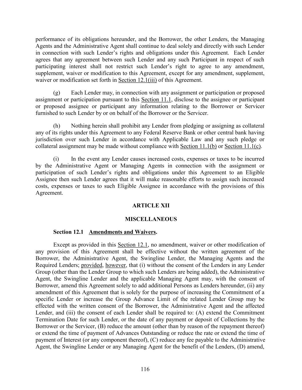 performance of its obligations hereunder, and the Borrower, the other Lenders, the Managing Agents and the Administrative Agent shall continue to deal solely and directly with such Lender in connection with such Lender’s rights and obligations under this Agreement. Each Lender agrees that any agreement between such Lender and any such Participant in respect of such participating interest shall not restrict such Lender’s right to agree to any amendment, supplement, waiver or modification to this Agreement, except for any amendment, supplement, waiver or modification set forth in Section 12.1(iii) of this Agreement. (g) Each Lender may, in connection with any assignment or participation or proposed assignment or participation pursuant to this Section 11.1, disclose to the assignee or participant or proposed assignee or participant any information relating to the Borrower or Servicer furnished to such Lender by or on behalf of the Borrower or the Servicer. (h) Nothing herein shall prohibit any Lender from pledging or assigning as collateral any of its rights under this Agreement to any Federal Reserve Bank or other central bank having jurisdiction over such Lender in accordance with Applicable Law and any such pledge or collateral assignment may be made without compliance with Section 11.1(b) or Section 11.1(c). (i) In the event any Lender causes increased costs, expenses or taxes to be incurred by the Administrative Agent or Managing Agents in connection with the assignment or participation of such Lender’s rights and obligations under this Agreement to an Eligible Assignee then such Lender agrees that it will make reasonable efforts to assign such increased costs, expenses or taxes to such Eligible Assignee in accordance with the provisions of this Agreement. ARTICLE XII MISCELLANEOUS Section 12.1 Amendments and Waivers. Except as provided in this Section 12.1, no amendment, waiver or other modification of any provision of this Agreement shall be effective without the written agreement of the Borrower, the Administrative Agent, the Swingline Lender, the Managing Agents and the Required Lenders; provided, however, that (i) without the consent of the Lenders in any Lender Group (other than the Lender Group to which such Lenders are being added), the Administrative Agent, the Swingline Lender and the applicable Managing Agent may, with the consent of Borrower, amend this Agreement solely to add additional Persons as Lenders hereunder, (ii) any amendment of this Agreement that is solely for the purpose of increasing the Commitment of a specific Lender or increase the Group Advance Limit of the related Lender Group may be effected with the written consent of the Borrower, the Administrative Agent and the affected Lender, and (iii) the consent of each Lender shall be required to: (A) extend the Commitment Termination Date for such Lender, or the date of any payment or deposit of Collections by the Borrower or the Servicer, (B) reduce the amount (other than by reason of the repayment thereof) or extend the time of payment of Advances Outstanding or reduce the rate or extend the time of payment of Interest (or any component thereof), (C) reduce any fee payable to the Administrative Agent, the Swingline Lender or any Managing Agent for the benefit of the Lenders, (D) amend, 116