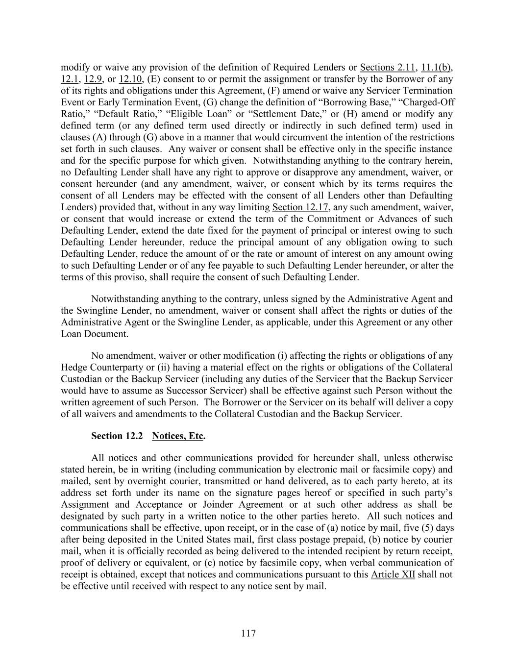 modify or waive any provision of the definition of Required Lenders or Sections 2.11, 11.1(b), 12.1, 12.9, or 12.10, (E) consent to or permit the assignment or transfer by the Borrower of any of its rights and obligations under this Agreement, (F) amend or waive any Servicer Termination Event or Early Termination Event, (G) change the definition of “Borrowing Base,” “Charged-Off Ratio,” “Default Ratio,” “Eligible Loan” or “Settlement Date,” or (H) amend or modify any defined term (or any defined term used directly or indirectly in such defined term) used in clauses (A) through (G) above in a manner that would circumvent the intention of the restrictions set forth in such clauses. Any waiver or consent shall be effective only in the specific instance and for the specific purpose for which given. Notwithstanding anything to the contrary herein, no Defaulting Lender shall have any right to approve or disapprove any amendment, waiver, or consent hereunder (and any amendment, waiver, or consent which by its terms requires the consent of all Lenders may be effected with the consent of all Lenders other than Defaulting Lenders) provided that, without in any way limiting Section 12.17, any such amendment, waiver, or consent that would increase or extend the term of the Commitment or Advances of such Defaulting Lender, extend the date fixed for the payment of principal or interest owing to such Defaulting Lender hereunder, reduce the principal amount of any obligation owing to such Defaulting Lender, reduce the amount of or the rate or amount of interest on any amount owing to such Defaulting Lender or of any fee payable to such Defaulting Lender hereunder, or alter the terms of this proviso, shall require the consent of such Defaulting Lender. Notwithstanding anything to the contrary, unless signed by the Administrative Agent and the Swingline Lender, no amendment, waiver or consent shall affect the rights or duties of the Administrative Agent or the Swingline Lender, as applicable, under this Agreement or any other Loan Document. No amendment, waiver or other modification (i) affecting the rights or obligations of any Hedge Counterparty or (ii) having a material effect on the rights or obligations of the Collateral Custodian or the Backup Servicer (including any duties of the Servicer that the Backup Servicer would have to assume as Successor Servicer) shall be effective against such Person without the written agreement of such Person. The Borrower or the Servicer on its behalf will deliver a copy of all waivers and amendments to the Collateral Custodian and the Backup Servicer. Section 12.2 Notices, Etc. All notices and other communications provided for hereunder shall, unless otherwise stated herein, be in writing (including communication by electronic mail or facsimile copy) and mailed, sent by overnight courier, transmitted or hand delivered, as to each party hereto, at its address set forth under its name on the signature pages hereof or specified in such party’s Assignment and Acceptance or Joinder Agreement or at such other address as shall be designated by such party in a written notice to the other parties hereto. All such notices and communications shall be effective, upon receipt, or in the case of (a) notice by mail, five (5) days after being deposited in the United States mail, first class postage prepaid, (b) notice by courier mail, when it is officially recorded as being delivered to the intended recipient by return receipt, proof of delivery or equivalent, or (c) notice by facsimile copy, when verbal communication of receipt is obtained, except that notices and communications pursuant to this Article XII shall not be effective until received with respect to any notice sent by mail. 117