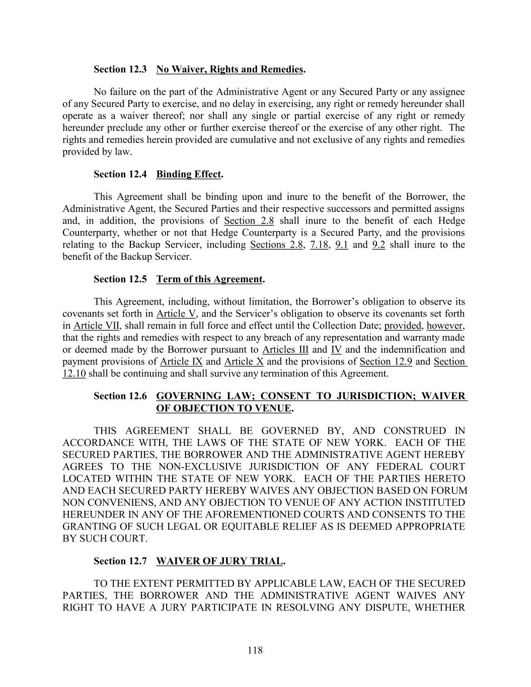 Section 12.3 No Waiver, Rights and Remedies. No failure on the part of the Administrative Agent or any Secured Party or any assignee of any Secured Party to exercise, and no delay in exercising, any right or remedy hereunder shall operate as a waiver thereof; nor shall any single or partial exercise of any right or remedy hereunder preclude any other or further exercise thereof or the exercise of any other right. The rights and remedies herein provided are cumulative and not exclusive of any rights and remedies provided by law. Section 12.4 Binding Effect. This Agreement shall be binding upon and inure to the benefit of the Borrower, the Administrative Agent, the Secured Parties and their respective successors and permitted assigns and, in addition, the provisions of Section 2.8 shall inure to the benefit of each Hedge Counterparty, whether or not that Hedge Counterparty is a Secured Party, and the provisions relating to the Backup Servicer, including Sections 2.8, 7.18, 9.1 and 9.2 shall inure to the benefit of the Backup Servicer. Section 12.5 Term of this Agreement. This Agreement, including, without limitation, the Borrower’s obligation to observe its covenants set forth in Article V, and the Servicer’s obligation to observe its covenants set forth in Article VII, shall remain in full force and effect until the Collection Date; provided, however, that the rights and remedies with respect to any breach of any representation and warranty made or deemed made by the Borrower pursuant to Articles III and IV and the indemnification and payment provisions of Article IX and Article X and the provisions of Section 12.9 and Section 12.10 shall be continuing and shall survive any termination of this Agreement. Section 12.6 GOVERNING LAW; CONSENT TO JURISDICTION; WAIVER OF OBJECTION TO VENUE. THIS AGREEMENT SHALL BE GOVERNED BY, AND CONSTRUED IN ACCORDANCE WITH, THE LAWS OF THE STATE OF NEW YORK. EACH OF THE SECURED PARTIES, THE BORROWER AND THE ADMINISTRATIVE AGENT HEREBY AGREES TO THE NON-EXCLUSIVE JURISDICTION OF ANY FEDERAL COURT LOCATED WITHIN THE STATE OF NEW YORK. EACH OF THE PARTIES HERETO AND EACH SECURED PARTY HEREBY WAIVES ANY OBJECTION BASED ON FORUM NON CONVENIENS, AND ANY OBJECTION TO VENUE OF ANY ACTION INSTITUTED HEREUNDER IN ANY OF THE AFOREMENTIONED COURTS AND CONSENTS TO THE GRANTING OF SUCH LEGAL OR EQUITABLE RELIEF AS IS DEEMED APPROPRIATE BY SUCH COURT. Section 12.7 WAIVER OF JURY TRIAL. TO THE EXTENT PERMITTED BY APPLICABLE LAW, EACH OF THE SECURED PARTIES, THE BORROWER AND THE ADMINISTRATIVE AGENT WAIVES ANY RIGHT TO HAVE A JURY PARTICIPATE IN RESOLVING ANY DISPUTE, WHETHER 118