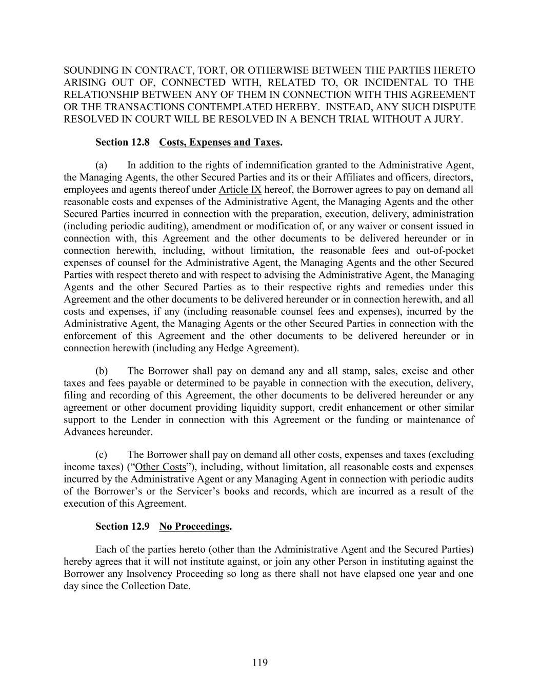 SOUNDING IN CONTRACT, TORT, OR OTHERWISE BETWEEN THE PARTIES HERETO ARISING OUT OF, CONNECTED WITH, RELATED TO, OR INCIDENTAL TO THE RELATIONSHIP BETWEEN ANY OF THEM IN CONNECTION WITH THIS AGREEMENT OR THE TRANSACTIONS CONTEMPLATED HEREBY. INSTEAD, ANY SUCH DISPUTE RESOLVED IN COURT WILL BE RESOLVED IN A BENCH TRIAL WITHOUT A JURY. Section 12.8 Costs, Expenses and Taxes. (a) In addition to the rights of indemnification granted to the Administrative Agent, the Managing Agents, the other Secured Parties and its or their Affiliates and officers, directors, employees and agents thereof under Article IX hereof, the Borrower agrees to pay on demand all reasonable costs and expenses of the Administrative Agent, the Managing Agents and the other Secured Parties incurred in connection with the preparation, execution, delivery, administration (including periodic auditing), amendment or modification of, or any waiver or consent issued in connection with, this Agreement and the other documents to be delivered hereunder or in connection herewith, including, without limitation, the reasonable fees and out-of-pocket expenses of counsel for the Administrative Agent, the Managing Agents and the other Secured Parties with respect thereto and with respect to advising the Administrative Agent, the Managing Agents and the other Secured Parties as to their respective rights and remedies under this Agreement and the other documents to be delivered hereunder or in connection herewith, and all costs and expenses, if any (including reasonable counsel fees and expenses), incurred by the Administrative Agent, the Managing Agents or the other Secured Parties in connection with the enforcement of this Agreement and the other documents to be delivered hereunder or in connection herewith (including any Hedge Agreement). (b) The Borrower shall pay on demand any and all stamp, sales, excise and other taxes and fees payable or determined to be payable in connection with the execution, delivery, filing and recording of this Agreement, the other documents to be delivered hereunder or any agreement or other document providing liquidity support, credit enhancement or other similar support to the Lender in connection with this Agreement or the funding or maintenance of Advances hereunder. (c) The Borrower shall pay on demand all other costs, expenses and taxes (excluding income taxes) (“Other Costs”), including, without limitation, all reasonable costs and expenses incurred by the Administrative Agent or any Managing Agent in connection with periodic audits of the Borrower’s or the Servicer’s books and records, which are incurred as a result of the execution of this Agreement. Section 12.9 No Proceedings. Each of the parties hereto (other than the Administrative Agent and the Secured Parties) hereby agrees that it will not institute against, or join any other Person in instituting against the Borrower any Insolvency Proceeding so long as there shall not have elapsed one year and one day since the Collection Date. 119