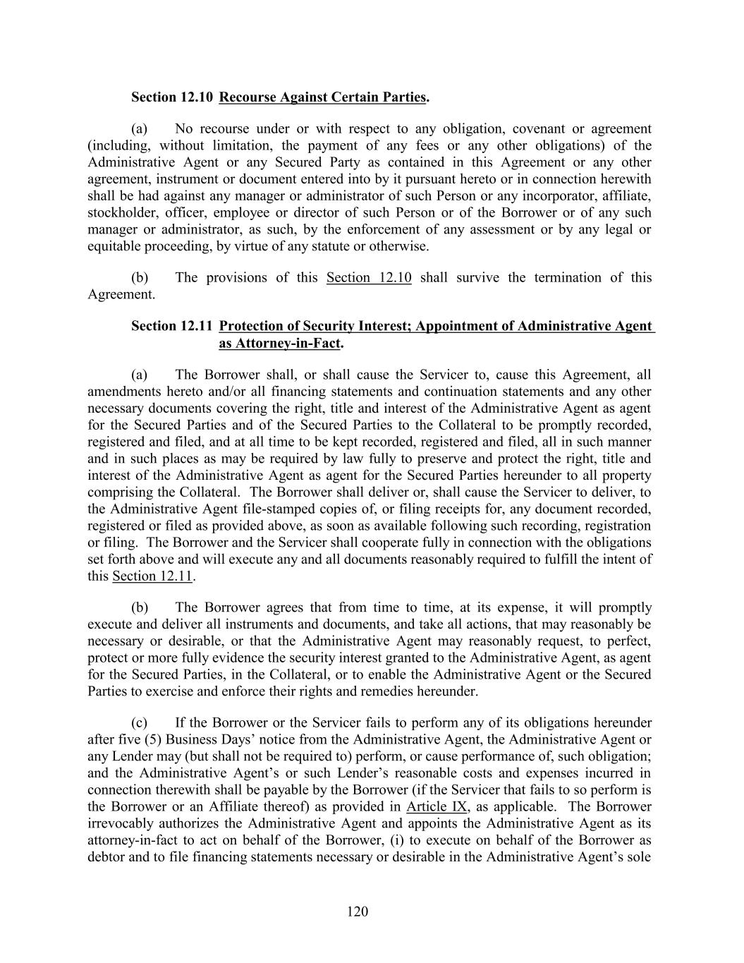 Section 12.10 Recourse Against Certain Parties. (a) No recourse under or with respect to any obligation, covenant or agreement (including, without limitation, the payment of any fees or any other obligations) of the Administrative Agent or any Secured Party as contained in this Agreement or any other agreement, instrument or document entered into by it pursuant hereto or in connection herewith shall be had against any manager or administrator of such Person or any incorporator, affiliate, stockholder, officer, employee or director of such Person or of the Borrower or of any such manager or administrator, as such, by the enforcement of any assessment or by any legal or equitable proceeding, by virtue of any statute or otherwise. (b) The provisions of this Section 12.10 shall survive the termination of this Agreement. Section 12.11 Protection of Security Interest; Appointment of Administrative Agent as Attorney-in-Fact. (a) The Borrower shall, or shall cause the Servicer to, cause this Agreement, all amendments hereto and/or all financing statements and continuation statements and any other necessary documents covering the right, title and interest of the Administrative Agent as agent for the Secured Parties and of the Secured Parties to the Collateral to be promptly recorded, registered and filed, and at all time to be kept recorded, registered and filed, all in such manner and in such places as may be required by law fully to preserve and protect the right, title and interest of the Administrative Agent as agent for the Secured Parties hereunder to all property comprising the Collateral. The Borrower shall deliver or, shall cause the Servicer to deliver, to the Administrative Agent file-stamped copies of, or filing receipts for, any document recorded, registered or filed as provided above, as soon as available following such recording, registration or filing. The Borrower and the Servicer shall cooperate fully in connection with the obligations set forth above and will execute any and all documents reasonably required to fulfill the intent of this Section 12.11. (b) The Borrower agrees that from time to time, at its expense, it will promptly execute and deliver all instruments and documents, and take all actions, that may reasonably be necessary or desirable, or that the Administrative Agent may reasonably request, to perfect, protect or more fully evidence the security interest granted to the Administrative Agent, as agent for the Secured Parties, in the Collateral, or to enable the Administrative Agent or the Secured Parties to exercise and enforce their rights and remedies hereunder. (c) If the Borrower or the Servicer fails to perform any of its obligations hereunder after five (5) Business Days’ notice from the Administrative Agent, the Administrative Agent or any Lender may (but shall not be required to) perform, or cause performance of, such obligation; and the Administrative Agent’s or such Lender’s reasonable costs and expenses incurred in connection therewith shall be payable by the Borrower (if the Servicer that fails to so perform is the Borrower or an Affiliate thereof) as provided in Article IX, as applicable. The Borrower irrevocably authorizes the Administrative Agent and appoints the Administrative Agent as its attorney-in-fact to act on behalf of the Borrower, (i) to execute on behalf of the Borrower as debtor and to file financing statements necessary or desirable in the Administrative Agent’s sole 120