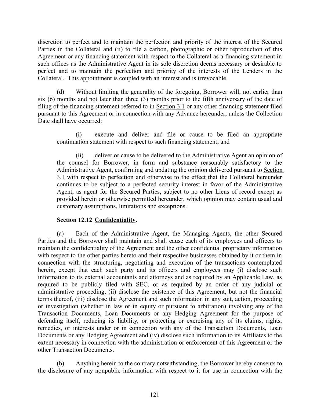 discretion to perfect and to maintain the perfection and priority of the interest of the Secured Parties in the Collateral and (ii) to file a carbon, photographic or other reproduction of this Agreement or any financing statement with respect to the Collateral as a financing statement in such offices as the Administrative Agent in its sole discretion deems necessary or desirable to perfect and to maintain the perfection and priority of the interests of the Lenders in the Collateral. This appointment is coupled with an interest and is irrevocable. (d) Without limiting the generality of the foregoing, Borrower will, not earlier than six (6) months and not later than three (3) months prior to the fifth anniversary of the date of filing of the financing statement referred to in Section 3.1 or any other financing statement filed pursuant to this Agreement or in connection with any Advance hereunder, unless the Collection Date shall have occurred: (i) execute and deliver and file or cause to be filed an appropriate continuation statement with respect to such financing statement; and (ii) deliver or cause to be delivered to the Administrative Agent an opinion of the counsel for Borrower, in form and substance reasonably satisfactory to the Administrative Agent, confirming and updating the opinion delivered pursuant to Section 3.1 with respect to perfection and otherwise to the effect that the Collateral hereunder continues to be subject to a perfected security interest in favor of the Administrative Agent, as agent for the Secured Parties, subject to no other Liens of record except as provided herein or otherwise permitted hereunder, which opinion may contain usual and customary assumptions, limitations and exceptions. Section 12.12 Confidentiality. (a) Each of the Administrative Agent, the Managing Agents, the other Secured Parties and the Borrower shall maintain and shall cause each of its employees and officers to maintain the confidentiality of the Agreement and the other confidential proprietary information with respect to the other parties hereto and their respective businesses obtained by it or them in connection with the structuring, negotiating and execution of the transactions contemplated herein, except that each such party and its officers and employees may (i) disclose such information to its external accountants and attorneys and as required by an Applicable Law, as required to be publicly filed with SEC, or as required by an order of any judicial or administrative proceeding, (ii) disclose the existence of this Agreement, but not the financial terms thereof, (iii) disclose the Agreement and such information in any suit, action, proceeding or investigation (whether in law or in equity or pursuant to arbitration) involving any of the Transaction Documents, Loan Documents or any Hedging Agreement for the purpose of defending itself, reducing its liability, or protecting or exercising any of its claims, rights, remedies, or interests under or in connection with any of the Transaction Documents, Loan Documents or any Hedging Agreement and (iv) disclose such information to its Affiliates to the extent necessary in connection with the administration or enforcement of this Agreement or the other Transaction Documents. (b) Anything herein to the contrary notwithstanding, the Borrower hereby consents to the disclosure of any nonpublic information with respect to it for use in connection with the 121