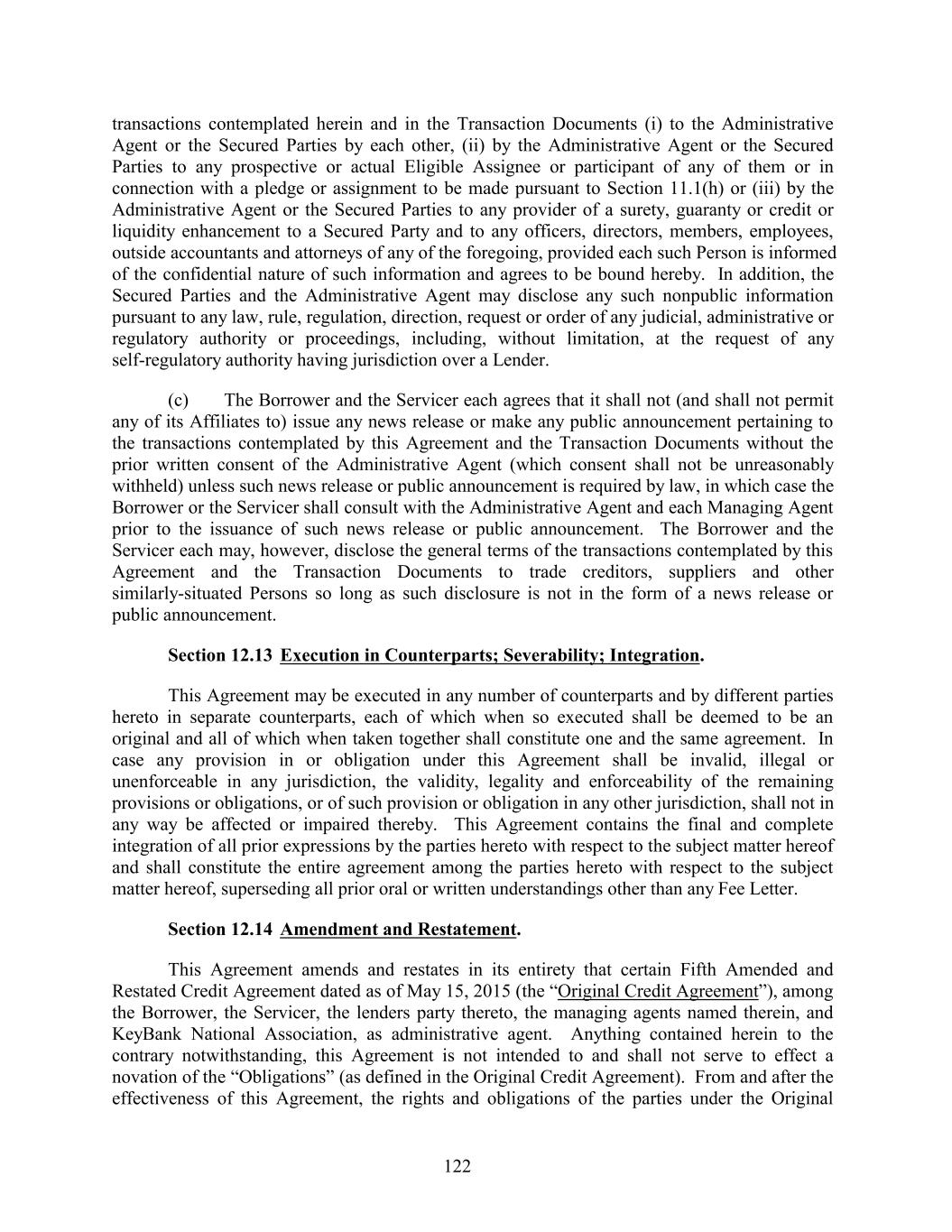 transactions contemplated herein and in the Transaction Documents (i) to the Administrative Agent or the Secured Parties by each other, (ii) by the Administrative Agent or the Secured Parties to any prospective or actual Eligible Assignee or participant of any of them or in connection with a pledge or assignment to be made pursuant to Section 11.1(h) or (iii) by the Administrative Agent or the Secured Parties to any provider of a surety, guaranty or credit or liquidity enhancement to a Secured Party and to any officers, directors, members, employees, outside accountants and attorneys of any of the foregoing, provided each such Person is informed of the confidential nature of such information and agrees to be bound hereby. In addition, the Secured Parties and the Administrative Agent may disclose any such nonpublic information pursuant to any law, rule, regulation, direction, request or order of any judicial, administrative or regulatory authority or proceedings, including, without limitation, at the request of any self-regulatory authority having jurisdiction over a Lender. (c) The Borrower and the Servicer each agrees that it shall not (and shall not permit any of its Affiliates to) issue any news release or make any public announcement pertaining to the transactions contemplated by this Agreement and the Transaction Documents without the prior written consent of the Administrative Agent (which consent shall not be unreasonably withheld) unless such news release or public announcement is required by law, in which case the Borrower or the Servicer shall consult with the Administrative Agent and each Managing Agent prior to the issuance of such news release or public announcement. The Borrower and the Servicer each may, however, disclose the general terms of the transactions contemplated by this Agreement and the Transaction Documents to trade creditors, suppliers and other similarly-situated Persons so long as such disclosure is not in the form of a news release or public announcement. Section 12.13 Execution in Counterparts; Severability; Integration. This Agreement may be executed in any number of counterparts and by different parties hereto in separate counterparts, each of which when so executed shall be deemed to be an original and all of which when taken together shall constitute one and the same agreement. In case any provision in or obligation under this Agreement shall be invalid, illegal or unenforceable in any jurisdiction, the validity, legality and enforceability of the remaining provisions or obligations, or of such provision or obligation in any other jurisdiction, shall not in any way be affected or impaired thereby. This Agreement contains the final and complete integration of all prior expressions by the parties hereto with respect to the subject matter hereof and shall constitute the entire agreement among the parties hereto with respect to the subject matter hereof, superseding all prior oral or written understandings other than any Fee Letter. Section 12.14 Amendment and Restatement. This Agreement amends and restates in its entirety that certain Fifth Amended and Restated Credit Agreement dated as of May 15, 2015 (the “Original Credit Agreement”), among the Borrower, the Servicer, the lenders party thereto, the managing agents named therein, and KeyBank National Association, as administrative agent. Anything contained herein to the contrary notwithstanding, this Agreement is not intended to and shall not serve to effect a novation of the “Obligations” (as defined in the Original Credit Agreement). From and after the effectiveness of this Agreement, the rights and obligations of the parties under the Original 122