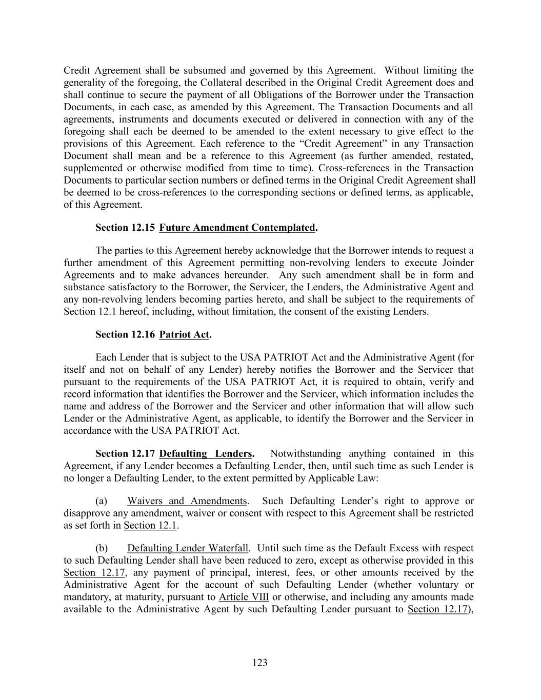 Credit Agreement shall be subsumed and governed by this Agreement. Without limiting the generality of the foregoing, the Collateral described in the Original Credit Agreement does and shall continue to secure the payment of all Obligations of the Borrower under the Transaction Documents, in each case, as amended by this Agreement. The Transaction Documents and all agreements, instruments and documents executed or delivered in connection with any of the foregoing shall each be deemed to be amended to the extent necessary to give effect to the provisions of this Agreement. Each reference to the “Credit Agreement” in any Transaction Document shall mean and be a reference to this Agreement (as further amended, restated, supplemented or otherwise modified from time to time). Cross-references in the Transaction Documents to particular section numbers or defined terms in the Original Credit Agreement shall be deemed to be cross-references to the corresponding sections or defined terms, as applicable, of this Agreement. Section 12.15 Future Amendment Contemplated. The parties to this Agreement hereby acknowledge that the Borrower intends to request a further amendment of this Agreement permitting non-revolving lenders to execute Joinder Agreements and to make advances hereunder. Any such amendment shall be in form and substance satisfactory to the Borrower, the Servicer, the Lenders, the Administrative Agent and any non-revolving lenders becoming parties hereto, and shall be subject to the requirements of Section 12.1 hereof, including, without limitation, the consent of the existing Lenders. Section 12.16 Patriot Act. Each Lender that is subject to the USA PATRIOT Act and the Administrative Agent (for itself and not on behalf of any Lender) hereby notifies the Borrower and the Servicer that pursuant to the requirements of the USA PATRIOT Act, it is required to obtain, verify and record information that identifies the Borrower and the Servicer, which information includes the name and address of the Borrower and the Servicer and other information that will allow such Lender or the Administrative Agent, as applicable, to identify the Borrower and the Servicer in accordance with the USA PATRIOT Act. Section 12.17 Defaulting Lenders. Notwithstanding anything contained in this Agreement, if any Lender becomes a Defaulting Lender, then, until such time as such Lender is no longer a Defaulting Lender, to the extent permitted by Applicable Law: (a) Waivers and Amendments. Such Defaulting Lender’s right to approve or disapprove any amendment, waiver or consent with respect to this Agreement shall be restricted as set forth in Section 12.1. (b) Defaulting Lender Waterfall. Until such time as the Default Excess with respect to such Defaulting Lender shall have been reduced to zero, except as otherwise provided in this Section 12.17, any payment of principal, interest, fees, or other amounts received by the Administrative Agent for the account of such Defaulting Lender (whether voluntary or mandatory, at maturity, pursuant to Article VIII or otherwise, and including any amounts made available to the Administrative Agent by such Defaulting Lender pursuant to Section 12.17), 123