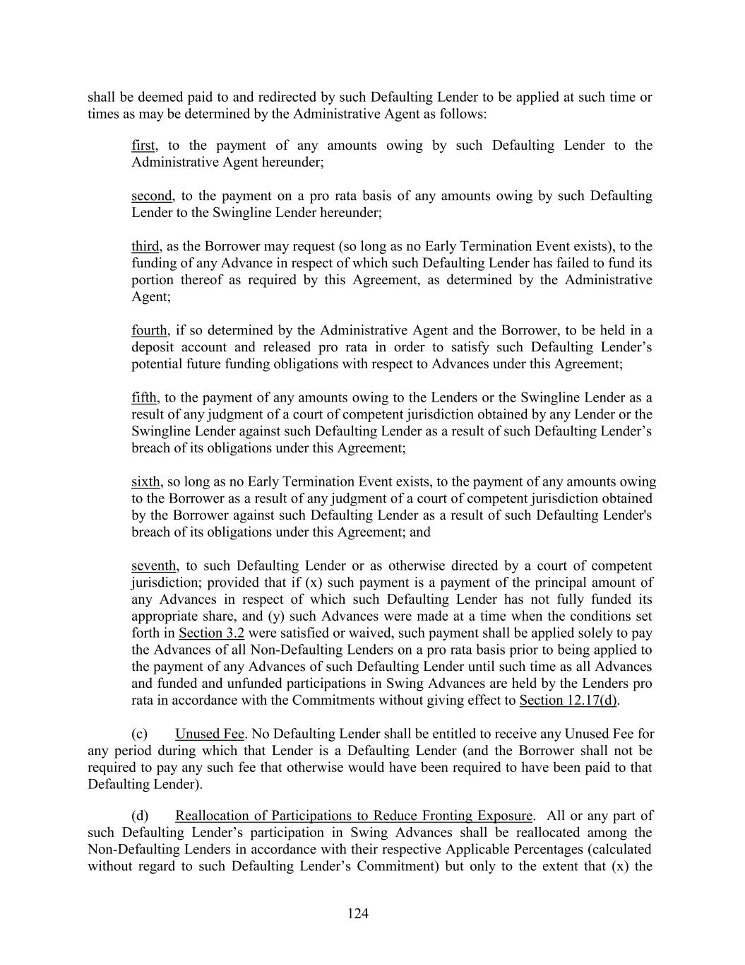 shall be deemed paid to and redirected by such Defaulting Lender to be applied at such time or times as may be determined by the Administrative Agent as follows: first, to the payment of any amounts owing by such Defaulting Lender to the Administrative Agent hereunder; second, to the payment on a pro rata basis of any amounts owing by such Defaulting Lender to the Swingline Lender hereunder; third, as the Borrower may request (so long as no Early Termination Event exists), to the funding of any Advance in respect of which such Defaulting Lender has failed to fund its portion thereof as required by this Agreement, as determined by the Administrative Agent; fourth, if so determined by the Administrative Agent and the Borrower, to be held in a deposit account and released pro rata in order to satisfy such Defaulting Lender’s potential future funding obligations with respect to Advances under this Agreement; fifth, to the payment of any amounts owing to the Lenders or the Swingline Lender as a result of any judgment of a court of competent jurisdiction obtained by any Lender or the Swingline Lender against such Defaulting Lender as a result of such Defaulting Lender’s breach of its obligations under this Agreement; sixth, so long as no Early Termination Event exists, to the payment of any amounts owing to the Borrower as a result of any judgment of a court of competent jurisdiction obtained by the Borrower against such Defaulting Lender as a result of such Defaulting Lender's breach of its obligations under this Agreement; and seventh, to such Defaulting Lender or as otherwise directed by a court of competent jurisdiction; provided that if (x) such payment is a payment of the principal amount of any Advances in respect of which such Defaulting Lender has not fully funded its appropriate share, and (y) such Advances were made at a time when the conditions set forth in Section 3.2 were satisfied or waived, such payment shall be applied solely to pay the Advances of all Non-Defaulting Lenders on a pro rata basis prior to being applied to the payment of any Advances of such Defaulting Lender until such time as all Advances and funded and unfunded participations in Swing Advances are held by the Lenders pro rata in accordance with the Commitments without giving effect to Section 12.17(d). (c) Unused Fee. No Defaulting Lender shall be entitled to receive any Unused Fee for any period during which that Lender is a Defaulting Lender (and the Borrower shall not be required to pay any such fee that otherwise would have been required to have been paid to that Defaulting Lender). (d) Reallocation of Participations to Reduce Fronting Exposure. All or any part of such Defaulting Lender’s participation in Swing Advances shall be reallocated among the Non-Defaulting Lenders in accordance with their respective Applicable Percentages (calculated without regard to such Defaulting Lender’s Commitment) but only to the extent that (x) the 124