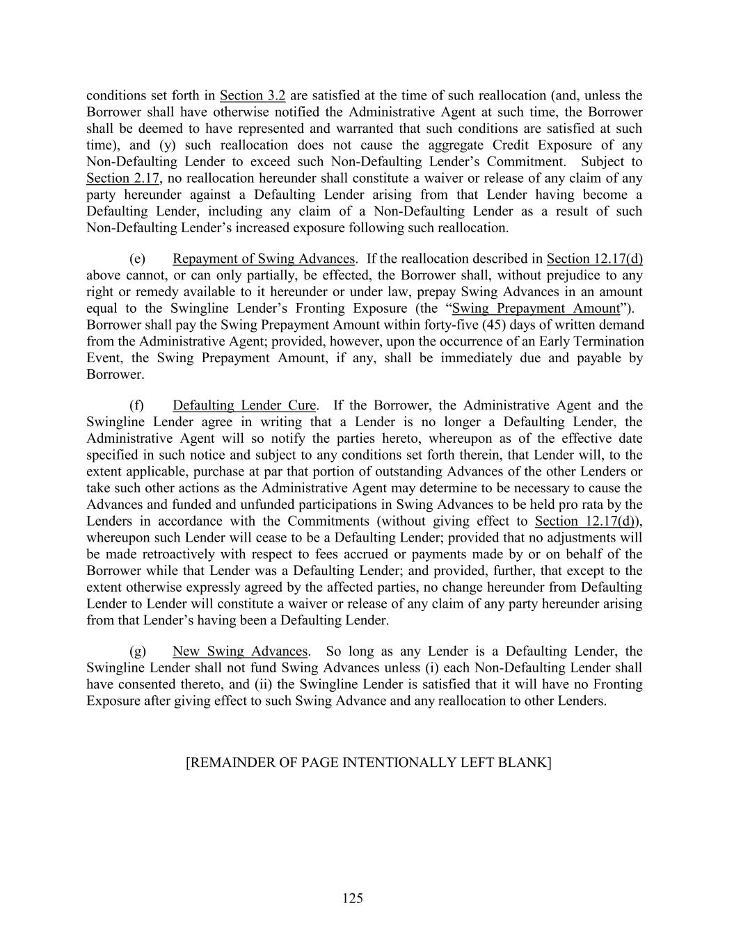 conditions set forth in Section 3.2 are satisfied at the time of such reallocation (and, unless the Borrower shall have otherwise notified the Administrative Agent at such time, the Borrower shall be deemed to have represented and warranted that such conditions are satisfied at such time), and (y) such reallocation does not cause the aggregate Credit Exposure of any Non-Defaulting Lender to exceed such Non-Defaulting Lender’s Commitment. Subject to Section 2.17, no reallocation hereunder shall constitute a waiver or release of any claim of any party hereunder against a Defaulting Lender arising from that Lender having become a Defaulting Lender, including any claim of a Non-Defaulting Lender as a result of such Non-Defaulting Lender’s increased exposure following such reallocation. (e) Repayment of Swing Advances. If the reallocation described in Section 12.17(d) above cannot, or can only partially, be effected, the Borrower shall, without prejudice to any right or remedy available to it hereunder or under law, prepay Swing Advances in an amount equal to the Swingline Lender’s Fronting Exposure (the “Swing Prepayment Amount”). Borrower shall pay the Swing Prepayment Amount within forty-five (45) days of written demand from the Administrative Agent; provided, however, upon the occurrence of an Early Termination Event, the Swing Prepayment Amount, if any, shall be immediately due and payable by Borrower. (f) Defaulting Lender Cure. If the Borrower, the Administrative Agent and the Swingline Lender agree in writing that a Lender is no longer a Defaulting Lender, the Administrative Agent will so notify the parties hereto, whereupon as of the effective date specified in such notice and subject to any conditions set forth therein, that Lender will, to the extent applicable, purchase at par that portion of outstanding Advances of the other Lenders or take such other actions as the Administrative Agent may determine to be necessary to cause the Advances and funded and unfunded participations in Swing Advances to be held pro rata by the Lenders in accordance with the Commitments (without giving effect to Section 12.17(d)), whereupon such Lender will cease to be a Defaulting Lender; provided that no adjustments will be made retroactively with respect to fees accrued or payments made by or on behalf of the Borrower while that Lender was a Defaulting Lender; and provided, further, that except to the extent otherwise expressly agreed by the affected parties, no change hereunder from Defaulting Lender to Lender will constitute a waiver or release of any claim of any party hereunder arising from that Lender’s having been a Defaulting Lender. (g) New Swing Advances. So long as any Lender is a Defaulting Lender, the Swingline Lender shall not fund Swing Advances unless (i) each Non-Defaulting Lender shall have consented thereto, and (ii) the Swingline Lender is satisfied that it will have no Fronting Exposure after giving effect to such Swing Advance and any reallocation to other Lenders. [REMAINDER OF PAGE INTENTIONALLY LEFT BLANK] 125