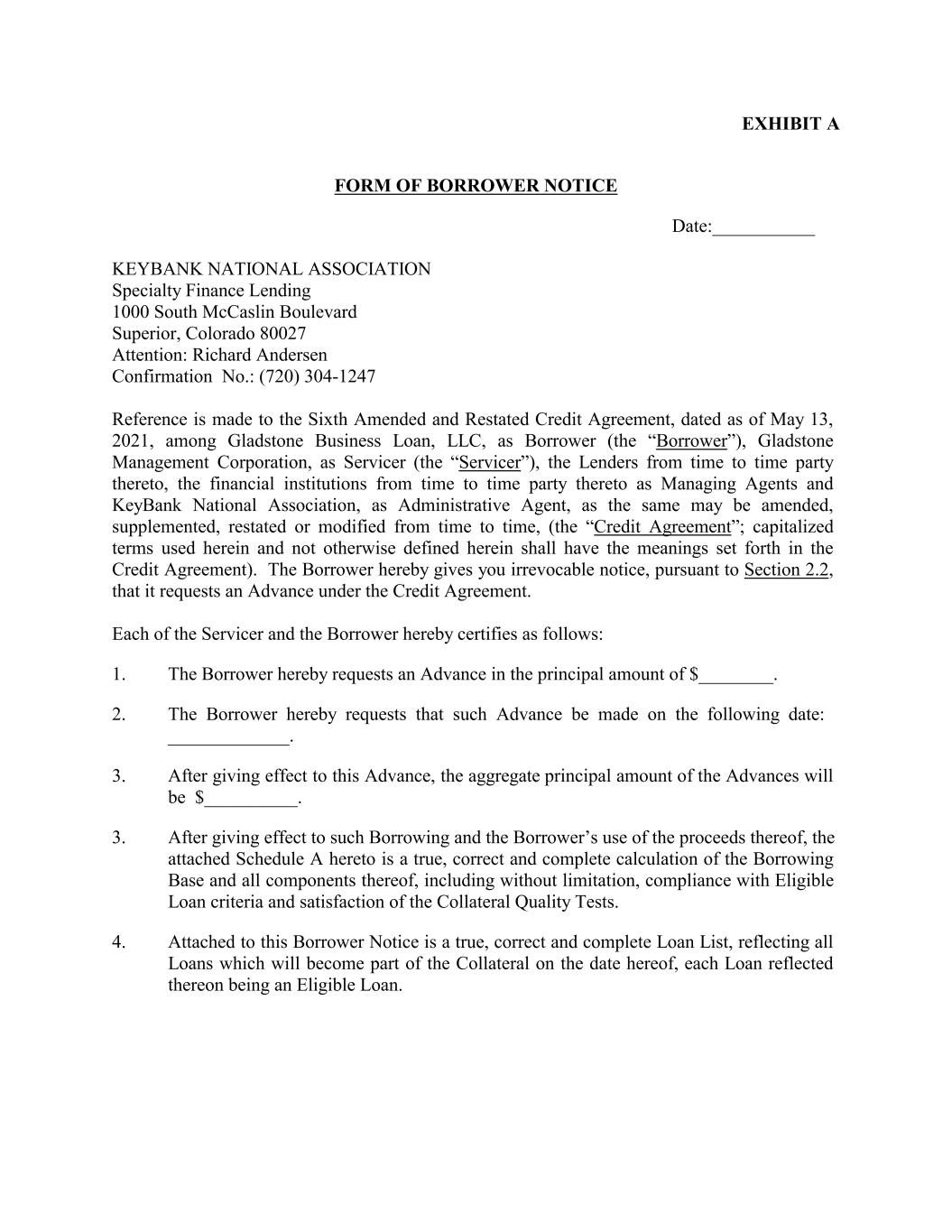 EXHIBIT A FORM OF BORROWER NOTICE Date:___________ KEYBANK NATIONAL ASSOCIATION Specialty Finance Lending 1000 South McCaslin Boulevard Superior, Colorado 80027 Attention: Richard Andersen Confirmation No.: (720) 304-1247 Reference is made to the Sixth Amended and Restated Credit Agreement, dated as of May 13, 2021, among Gladstone Business Loan, LLC, as Borrower (the “Borrower”), Gladstone Management Corporation, as Servicer (the “Servicer”), the Lenders from time to time party thereto, the financial institutions from time to time party thereto as Managing Agents and KeyBank National Association, as Administrative Agent, as the same may be amended, supplemented, restated or modified from time to time, (the “Credit Agreement”; capitalized terms used herein and not otherwise defined herein shall have the meanings set forth in the Credit Agreement). The Borrower hereby gives you irrevocable notice, pursuant to Section 2.2, that it requests an Advance under the Credit Agreement. Each of the Servicer and the Borrower hereby certifies as follows: 1. The Borrower hereby requests an Advance in the principal amount of $________. 2. The Borrower hereby requests that such Advance be made on the following date: _____________. 3. After giving effect to this Advance, the aggregate principal amount of the Advances will be $__________. 3. After giving effect to such Borrowing and the Borrower’s use of the proceeds thereof, the attached Schedule A hereto is a true, correct and complete calculation of the Borrowing Base and all components thereof, including without limitation, compliance with Eligible Loan criteria and satisfaction of the Collateral Quality Tests. 4. Attached to this Borrower Notice is a true, correct and complete Loan List, reflecting all Loans which will become part of the Collateral on the date hereof, each Loan reflected thereon being an Eligible Loan.