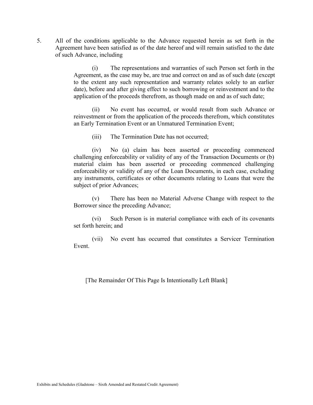 5. All of the conditions applicable to the Advance requested herein as set forth in the Agreement have been satisfied as of the date hereof and will remain satisfied to the date of such Advance, including (i) The representations and warranties of such Person set forth in the Agreement, as the case may be, are true and correct on and as of such date (except to the extent any such representation and warranty relates solely to an earlier date), before and after giving effect to such borrowing or reinvestment and to the application of the proceeds therefrom, as though made on and as of such date; (ii) No event has occurred, or would result from such Advance or reinvestment or from the application of the proceeds therefrom, which constitutes an Early Termination Event or an Unmatured Termination Event; (iii) The Termination Date has not occurred; (iv) No (a) claim has been asserted or proceeding commenced challenging enforceability or validity of any of the Transaction Documents or (b) material claim has been asserted or proceeding commenced challenging enforceability or validity of any of the Loan Documents, in each case, excluding any instruments, certificates or other documents relating to Loans that were the subject of prior Advances; (v) There has been no Material Adverse Change with respect to the Borrower since the preceding Advance; (vi) Such Person is in material compliance with each of its covenants set forth herein; and (vii) No event has occurred that constitutes a Servicer Termination Event. [The Remainder Of This Page Is Intentionally Left Blank] Exhibits and Schedules (Gladstone – Sixth Amended and Restated Credit Agreement)