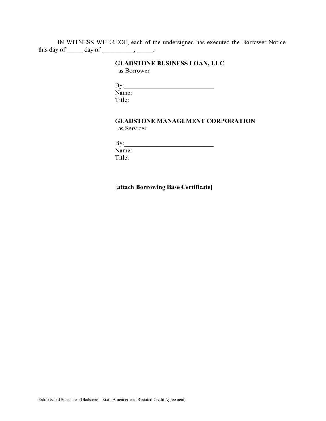 IN WITNESS WHEREOF, each of the undersigned has executed the Borrower Notice this day of _____ day of __________, _____. GLADSTONE BUSINESS LOAN, LLC as Borrower By:____________________________ Name: Title: GLADSTONE MANAGEMENT CORPORATION as Servicer By:____________________________ Name: Title: [attach Borrowing Base Certificate] Exhibits and Schedules (Gladstone – Sixth Amended and Restated Credit Agreement)