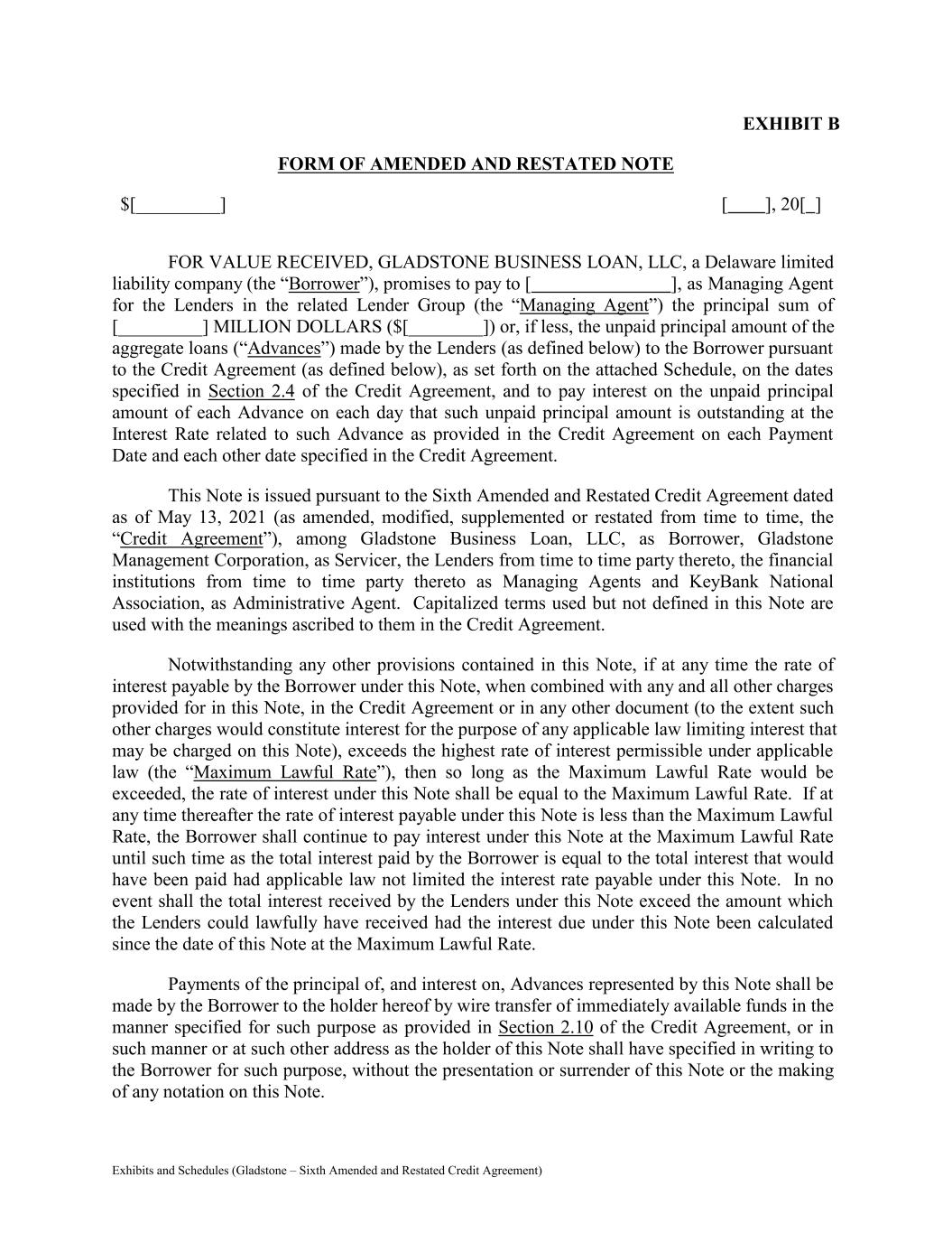 Exhibits and Schedules (Gladstone – Sixth Amended and Restated Credit Agreement) $[_________] [ ], 20[ ] EXHIBIT B FORM OF AMENDED AND RESTATED NOTE FOR VALUE RECEIVED, GLADSTONE BUSINESS LOAN, LLC, a Delaware limited liability company (the “Borrower”), promises to pay to [ ], as Managing Agent for the Lenders in the related Lender Group (the “Managing Agent”) the principal sum of [_________] MILLION DOLLARS ($[________]) or, if less, the unpaid principal amount of the aggregate loans (“Advances”) made by the Lenders (as defined below) to the Borrower pursuant to the Credit Agreement (as defined below), as set forth on the attached Schedule, on the dates specified in Section 2.4 of the Credit Agreement, and to pay interest on the unpaid principal amount of each Advance on each day that such unpaid principal amount is outstanding at the Interest Rate related to such Advance as provided in the Credit Agreement on each Payment Date and each other date specified in the Credit Agreement. This Note is issued pursuant to the Sixth Amended and Restated Credit Agreement dated as of May 13, 2021 (as amended, modified, supplemented or restated from time to time, the “Credit Agreement”), among Gladstone Business Loan, LLC, as Borrower, Gladstone Management Corporation, as Servicer, the Lenders from time to time party thereto, the financial institutions from time to time party thereto as Managing Agents and KeyBank National Association, as Administrative Agent. Capitalized terms used but not defined in this Note are used with the meanings ascribed to them in the Credit Agreement. Notwithstanding any other provisions contained in this Note, if at any time the rate of interest payable by the Borrower under this Note, when combined with any and all other charges provided for in this Note, in the Credit Agreement or in any other document (to the extent such other charges would constitute interest for the purpose of any applicable law limiting interest that may be charged on this Note), exceeds the highest rate of interest permissible under applicable law (the “Maximum Lawful Rate”), then so long as the Maximum Lawful Rate would be exceeded, the rate of interest under this Note shall be equal to the Maximum Lawful Rate. If at any time thereafter the rate of interest payable under this Note is less than the Maximum Lawful Rate, the Borrower shall continue to pay interest under this Note at the Maximum Lawful Rate until such time as the total interest paid by the Borrower is equal to the total interest that would have been paid had applicable law not limited the interest rate payable under this Note. In no event shall the total interest received by the Lenders under this Note exceed the amount which the Lenders could lawfully have received had the interest due under this Note been calculated since the date of this Note at the Maximum Lawful Rate. Payments of the principal of, and interest on, Advances represented by this Note shall be made by the Borrower to the holder hereof by wire transfer of immediately available funds in the manner specified for such purpose as provided in Section 2.10 of the Credit Agreement, or in such manner or at such other address as the holder of this Note shall have specified in writing to the Borrower for such purpose, without the presentation or surrender of this Note or the making of any notation on this Note.