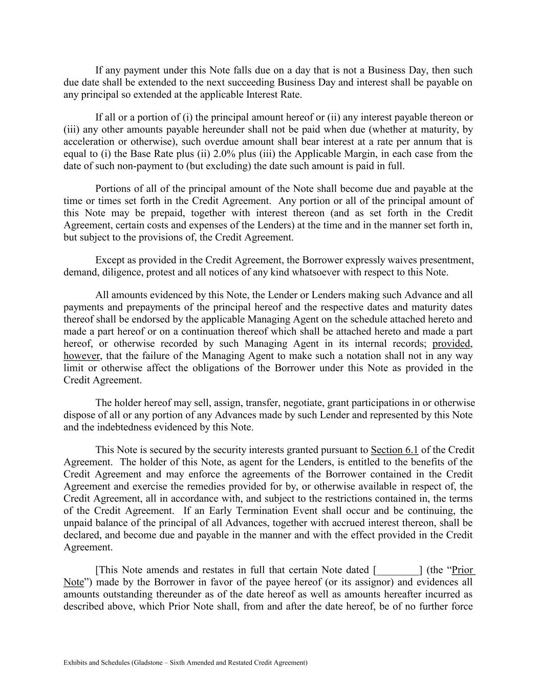 If any payment under this Note falls due on a day that is not a Business Day, then such due date shall be extended to the next succeeding Business Day and interest shall be payable on any principal so extended at the applicable Interest Rate. If all or a portion of (i) the principal amount hereof or (ii) any interest payable thereon or (iii) any other amounts payable hereunder shall not be paid when due (whether at maturity, by acceleration or otherwise), such overdue amount shall bear interest at a rate per annum that is equal to (i) the Base Rate plus (ii) 2.0% plus (iii) the Applicable Margin, in each case from the date of such non-payment to (but excluding) the date such amount is paid in full. Portions of all of the principal amount of the Note shall become due and payable at the time or times set forth in the Credit Agreement. Any portion or all of the principal amount of this Note may be prepaid, together with interest thereon (and as set forth in the Credit Agreement, certain costs and expenses of the Lenders) at the time and in the manner set forth in, but subject to the provisions of, the Credit Agreement. Except as provided in the Credit Agreement, the Borrower expressly waives presentment, demand, diligence, protest and all notices of any kind whatsoever with respect to this Note. All amounts evidenced by this Note, the Lender or Lenders making such Advance and all payments and prepayments of the principal hereof and the respective dates and maturity dates thereof shall be endorsed by the applicable Managing Agent on the schedule attached hereto and made a part hereof or on a continuation thereof which shall be attached hereto and made a part hereof, or otherwise recorded by such Managing Agent in its internal records; provided, however, that the failure of the Managing Agent to make such a notation shall not in any way limit or otherwise affect the obligations of the Borrower under this Note as provided in the Credit Agreement. The holder hereof may sell, assign, transfer, negotiate, grant participations in or otherwise dispose of all or any portion of any Advances made by such Lender and represented by this Note and the indebtedness evidenced by this Note. This Note is secured by the security interests granted pursuant to Section 6.1 of the Credit Agreement. The holder of this Note, as agent for the Lenders, is entitled to the benefits of the Credit Agreement and may enforce the agreements of the Borrower contained in the Credit Agreement and exercise the remedies provided for by, or otherwise available in respect of, the Credit Agreement, all in accordance with, and subject to the restrictions contained in, the terms of the Credit Agreement. If an Early Termination Event shall occur and be continuing, the unpaid balance of the principal of all Advances, together with accrued interest thereon, shall be declared, and become due and payable in the manner and with the effect provided in the Credit Agreement. [This Note amends and restates in full that certain Note dated [________] (the “Prior Note”) made by the Borrower in favor of the payee hereof (or its assignor) and evidences all amounts outstanding thereunder as of the date hereof as well as amounts hereafter incurred as described above, which Prior Note shall, from and after the date hereof, be of no further force Exhibits and Schedules (Gladstone – Sixth Amended and Restated Credit Agreement)