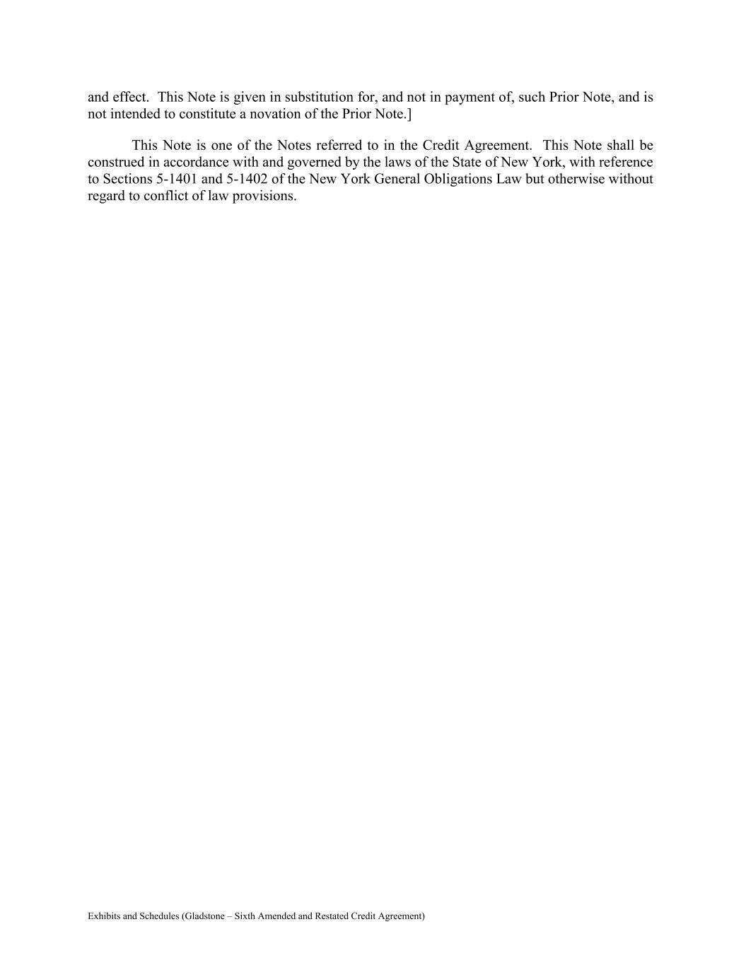 and effect. This Note is given in substitution for, and not in payment of, such Prior Note, and is not intended to constitute a novation of the Prior Note.] This Note is one of the Notes referred to in the Credit Agreement. This Note shall be construed in accordance with and governed by the laws of the State of New York, with reference to Sections 5-1401 and 5-1402 of the New York General Obligations Law but otherwise without regard to conflict of law provisions. Exhibits and Schedules (Gladstone – Sixth Amended and Restated Credit Agreement)
