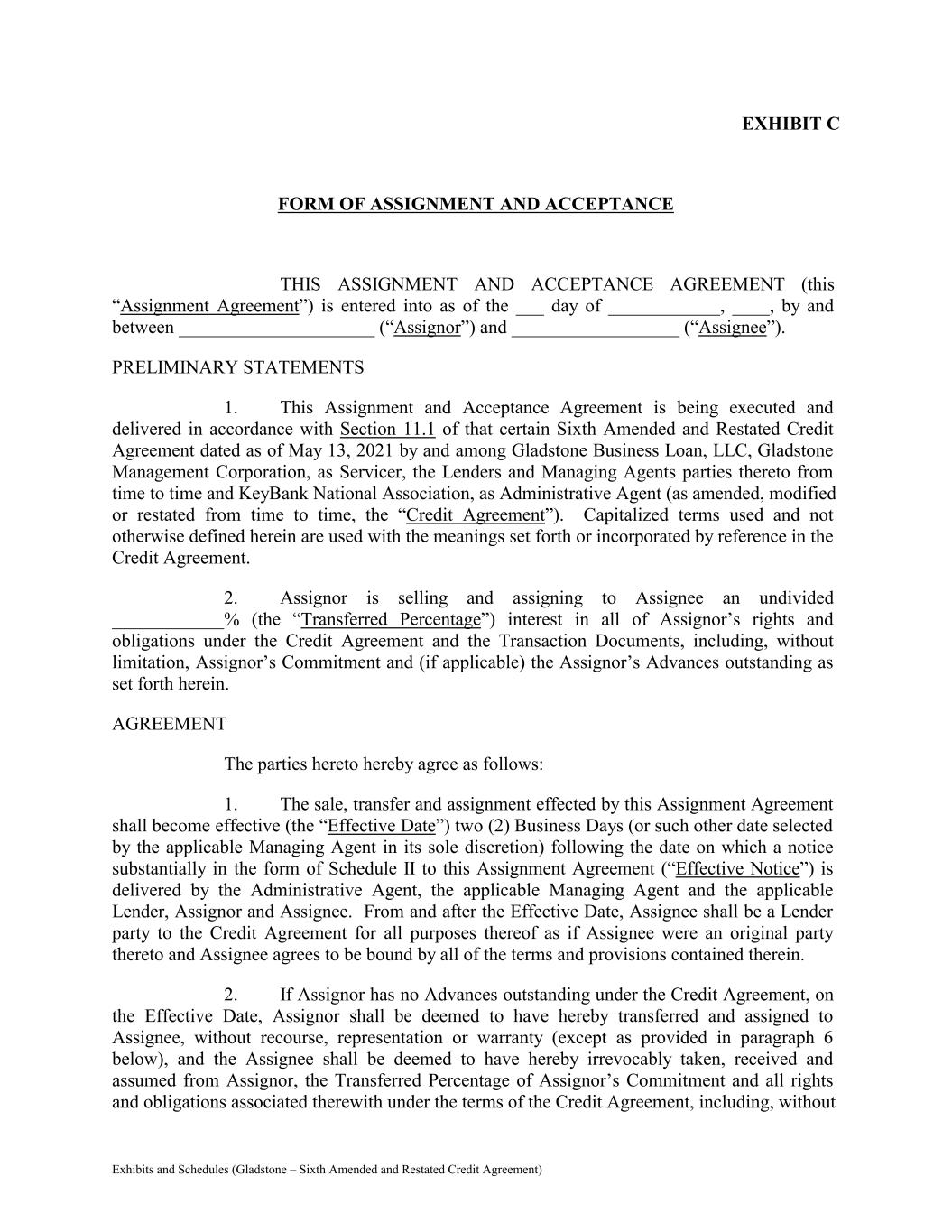 EXHIBIT C FORM OF ASSIGNMENT AND ACCEPTANCE THIS ASSIGNMENT AND ACCEPTANCE AGREEMENT (this “Assignment Agreement”) is entered into as of the ___ day of ____________, ____, by and between _____________________ (“Assignor”) and __________________ (“Assignee”). PRELIMINARY STATEMENTS 1. This Assignment and Acceptance Agreement is being executed and delivered in accordance with Section 11.1 of that certain Sixth Amended and Restated Credit Agreement dated as of May 13, 2021 by and among Gladstone Business Loan, LLC, Gladstone Management Corporation, as Servicer, the Lenders and Managing Agents parties thereto from time to time and KeyBank National Association, as Administrative Agent (as amended, modified or restated from time to time, the “Credit Agreement”). Capitalized terms used and not otherwise defined herein are used with the meanings set forth or incorporated by reference in the Credit Agreement. 2. Assignor is selling and assigning to Assignee an undivided ____________% (the “Transferred Percentage”) interest in all of Assignor’s rights and obligations under the Credit Agreement and the Transaction Documents, including, without limitation, Assignor’s Commitment and (if applicable) the Assignor’s Advances outstanding as set forth herein. AGREEMENT The parties hereto hereby agree as follows: 1. The sale, transfer and assignment effected by this Assignment Agreement shall become effective (the “Effective Date”) two (2) Business Days (or such other date selected by the applicable Managing Agent in its sole discretion) following the date on which a notice substantially in the form of Schedule II to this Assignment Agreement (“Effective Notice”) is delivered by the Administrative Agent, the applicable Managing Agent and the applicable Lender, Assignor and Assignee. From and after the Effective Date, Assignee shall be a Lender party to the Credit Agreement for all purposes thereof as if Assignee were an original party thereto and Assignee agrees to be bound by all of the terms and provisions contained therein. 2. If Assignor has no Advances outstanding under the Credit Agreement, on the Effective Date, Assignor shall be deemed to have hereby transferred and assigned to Assignee, without recourse, representation or warranty (except as provided in paragraph 6 below), and the Assignee shall be deemed to have hereby irrevocably taken, received and assumed from Assignor, the Transferred Percentage of Assignor’s Commitment and all rights and obligations associated therewith under the terms of the Credit Agreement, including, without Exhibits and Schedules (Gladstone – Sixth Amended and Restated Credit Agreement)