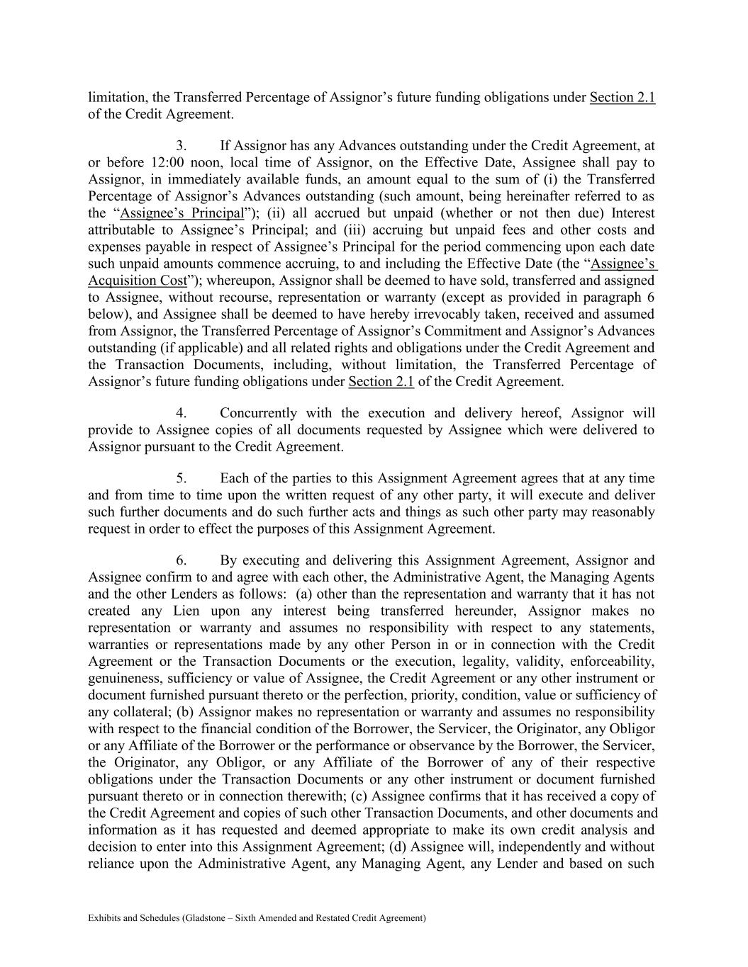 limitation, the Transferred Percentage of Assignor’s future funding obligations under Section 2.1 of the Credit Agreement. 3. If Assignor has any Advances outstanding under the Credit Agreement, at or before 12:00 noon, local time of Assignor, on the Effective Date, Assignee shall pay to Assignor, in immediately available funds, an amount equal to the sum of (i) the Transferred Percentage of Assignor’s Advances outstanding (such amount, being hereinafter referred to as the “Assignee’s Principal”); (ii) all accrued but unpaid (whether or not then due) Interest attributable to Assignee’s Principal; and (iii) accruing but unpaid fees and other costs and expenses payable in respect of Assignee’s Principal for the period commencing upon each date such unpaid amounts commence accruing, to and including the Effective Date (the “Assignee’s Acquisition Cost”); whereupon, Assignor shall be deemed to have sold, transferred and assigned to Assignee, without recourse, representation or warranty (except as provided in paragraph 6 below), and Assignee shall be deemed to have hereby irrevocably taken, received and assumed from Assignor, the Transferred Percentage of Assignor’s Commitment and Assignor’s Advances outstanding (if applicable) and all related rights and obligations under the Credit Agreement and the Transaction Documents, including, without limitation, the Transferred Percentage of Assignor’s future funding obligations under Section 2.1 of the Credit Agreement. 4. Concurrently with the execution and delivery hereof, Assignor will provide to Assignee copies of all documents requested by Assignee which were delivered to Assignor pursuant to the Credit Agreement. 5. Each of the parties to this Assignment Agreement agrees that at any time and from time to time upon the written request of any other party, it will execute and deliver such further documents and do such further acts and things as such other party may reasonably request in order to effect the purposes of this Assignment Agreement. 6. By executing and delivering this Assignment Agreement, Assignor and Assignee confirm to and agree with each other, the Administrative Agent, the Managing Agents and the other Lenders as follows: (a) other than the representation and warranty that it has not created any Lien upon any interest being transferred hereunder, Assignor makes no representation or warranty and assumes no responsibility with respect to any statements, warranties or representations made by any other Person in or in connection with the Credit Agreement or the Transaction Documents or the execution, legality, validity, enforceability, genuineness, sufficiency or value of Assignee, the Credit Agreement or any other instrument or document furnished pursuant thereto or the perfection, priority, condition, value or sufficiency of any collateral; (b) Assignor makes no representation or warranty and assumes no responsibility with respect to the financial condition of the Borrower, the Servicer, the Originator, any Obligor or any Affiliate of the Borrower or the performance or observance by the Borrower, the Servicer, the Originator, any Obligor, or any Affiliate of the Borrower of any of their respective obligations under the Transaction Documents or any other instrument or document furnished pursuant thereto or in connection therewith; (c) Assignee confirms that it has received a copy of the Credit Agreement and copies of such other Transaction Documents, and other documents and information as it has requested and deemed appropriate to make its own credit analysis and decision to enter into this Assignment Agreement; (d) Assignee will, independently and without reliance upon the Administrative Agent, any Managing Agent, any Lender and based on such Exhibits and Schedules (Gladstone – Sixth Amended and Restated Credit Agreement)