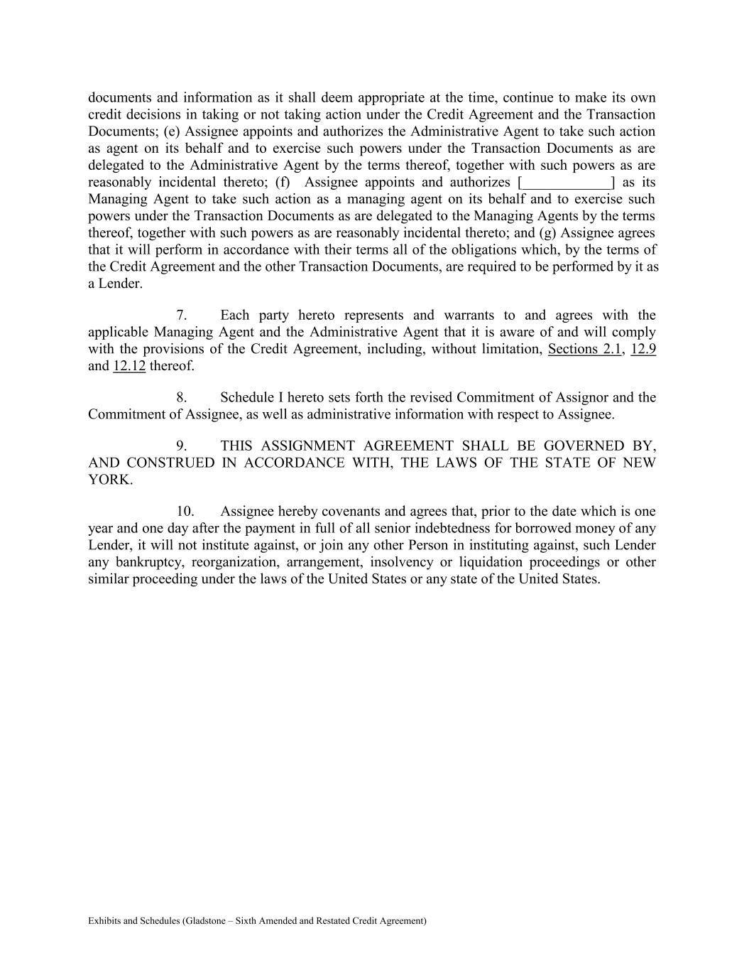documents and information as it shall deem appropriate at the time, continue to make its own credit decisions in taking or not taking action under the Credit Agreement and the Transaction Documents; (e) Assignee appoints and authorizes the Administrative Agent to take such action as agent on its behalf and to exercise such powers under the Transaction Documents as are delegated to the Administrative Agent by the terms thereof, together with such powers as are reasonably incidental thereto; (f) Assignee appoints and authorizes [____________] as its Managing Agent to take such action as a managing agent on its behalf and to exercise such powers under the Transaction Documents as are delegated to the Managing Agents by the terms thereof, together with such powers as are reasonably incidental thereto; and (g) Assignee agrees that it will perform in accordance with their terms all of the obligations which, by the terms of the Credit Agreement and the other Transaction Documents, are required to be performed by it as a Lender. 7. Each party hereto represents and warrants to and agrees with the applicable Managing Agent and the Administrative Agent that it is aware of and will comply with the provisions of the Credit Agreement, including, without limitation, Sections 2.1, 12.9 and 12.12 thereof. 8. Schedule I hereto sets forth the revised Commitment of Assignor and the Commitment of Assignee, as well as administrative information with respect to Assignee. 9. THIS ASSIGNMENT AGREEMENT SHALL BE GOVERNED BY, AND CONSTRUED IN ACCORDANCE WITH, THE LAWS OF THE STATE OF NEW YORK. 10. Assignee hereby covenants and agrees that, prior to the date which is one year and one day after the payment in full of all senior indebtedness for borrowed money of any Lender, it will not institute against, or join any other Person in instituting against, such Lender any bankruptcy, reorganization, arrangement, insolvency or liquidation proceedings or other similar proceeding under the laws of the United States or any state of the United States. Exhibits and Schedules (Gladstone – Sixth Amended and Restated Credit Agreement)