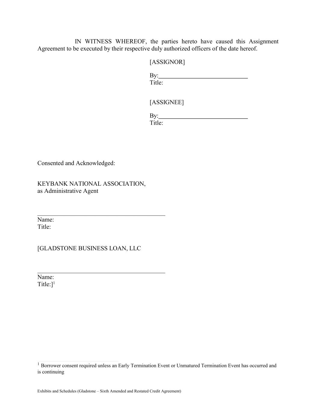 Exhibits and Schedules (Gladstone – Sixth Amended and Restated Credit Agreement) IN WITNESS WHEREOF, the parties hereto have caused this Assignment Agreement to be executed by their respective duly authorized officers of the date hereof. [ASSIGNOR] By: Title: [ASSIGNEE] By: Title: Consented and Acknowledged: KEYBANK NATIONAL ASSOCIATION, as Administrative Agent _________________________________________ Name: Title: [GLADSTONE BUSINESS LOAN, LLC _________________________________________ Name: Title:]1 1 Borrower consent required unless an Early Termination Event or Unmatured Termination Event has occurred and is continuing