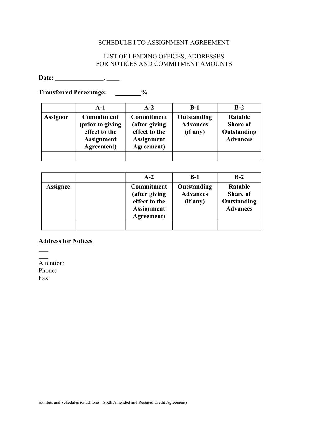 Exhibits and Schedules (Gladstone – Sixth Amended and Restated Credit Agreement) A-1 Commitment (prior to giving effect to the Assignment Agreement) SCHEDULE I TO ASSIGNMENT AGREEMENT LIST OF LENDING OFFICES, ADDRESSES FOR NOTICES AND COMMITMENT AMOUNTS Date: _______________, ____ Transferred Percentage: ________% Commitment (after giving effect to the Assignment Agreement) A-2 A-2 Outstanding Advances (if any) B-1 B-2 Ratable Share of Outstanding Advances B-1 Assignee Commitment (after giving effect to the Assignment Agreement) Outstanding Advances (if any) B-2 Ratable Share of Outstanding Advances Address for Notices Attention: Phone: Fax: Assignor