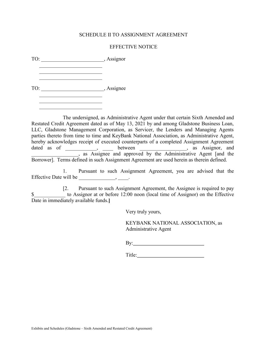 SCHEDULE II TO ASSIGNMENT AGREEMENT EFFECTIVE NOTICE TO: ________________________, Assignor ________________________ ________________________ ________________________ TO: ________________________, Assignee ________________________ ________________________ ________________________ The undersigned, as Administrative Agent under that certain Sixth Amended and Restated Credit Agreement dated as of May 13, 2021 by and among Gladstone Business Loan, LLC, Gladstone Management Corporation, as Servicer, the Lenders and Managing Agents parties thereto from time to time and KeyBank National Association, as Administrative Agent, hereby acknowledges receipt of executed counterparts of a completed Assignment Agreement dated as of ____________, ____ between __________________, as Assignor, and __________________, as Assignee and approved by the Administrative Agent [and the Borrower]. Terms defined in such Assignment Agreement are used herein as therein defined. 1. Pursuant to such Assignment Agreement, you are advised that the Effective Date will be ______________, ____. [2. Pursuant to such Assignment Agreement, the Assignee is required to pay $____________ to Assignor at or before 12:00 noon (local time of Assignor) on the Effective Date in immediately available funds.] Very truly yours, KEYBANK NATIONAL ASSOCIATION, as Administrative Agent By: Title: Exhibits and Schedules (Gladstone – Sixth Amended and Restated Credit Agreement)