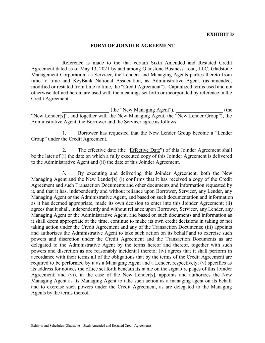 EXHIBIT D FORM OF JOINDER AGREEMENT Reference is made to the that certain Sixth Amended and Restated Credit Agreement dated as of May 13, 2021 by and among Gladstone Business Loan, LLC, Gladstone Management Corporation, as Servicer, the Lenders and Managing Agents parties thereto from time to time and KeyBank National Association, as Administrative Agent, (as amended, modified or restated from time to time, the “Credit Agreement”). Capitalized terms used and not otherwise defined herein are used with the meanings set forth or incorporated by reference in the Credit Agreement. __________________ (the “New Managing Agent”), __________________ (the “New Lender[s]”; and together with the New Managing Agent, the “New Lender Group”), the Administrative Agent, the Borrower and the Servicer agree as follows: 1. Borrower has requested that the New Lender Group become a “Lender Group” under the Credit Agreement. 2. The effective date (the “Effective Date”) of this Joinder Agreement shall be the later of (i) the date on which a fully executed copy of this Joinder Agreement is delivered to the Administrative Agent and (ii) the date of this Joinder Agreement. 3. By executing and delivering this Joinder Agreement, both the New Managing Agent and the New Lender[s] (i) confirms that it has received a copy of the Credit Agreement and such Transaction Documents and other documents and information requested by it, and that it has, independently and without reliance upon Borrower, Servicer, any Lender, any Managing Agent or the Administrative Agent, and based on such documentation and information as it has deemed appropriate, made its own decision to enter into this Joinder Agreement; (ii) agrees that it shall, independently and without reliance upon Borrower, Servicer, any Lender, any Managing Agent or the Administrative Agent, and based on such documents and information as it shall deem appropriate at the time, continue to make its own credit decisions in taking or not taking action under the Credit Agreement and any of the Transaction Documents; (iii) appoints and authorizes the Administrative Agent to take such action on its behalf and to exercise such powers and discretion under the Credit Agreement and the Transaction Documents as are delegated to the Administrative Agent by the terms hereof and thereof, together with such powers and discretion as are reasonably incidental thereto; (iv) agrees that it shall perform in accordance with their terms all of the obligations that by the terms of the Credit Agreement are required to be performed by it as a Managing Agent and a Lender, respectively; (v) specifies as its address for notices the office set forth beneath its name on the signature pages of this Joinder Agreement; and (vi), in the case of the New Lender[s], appoints and authorizes the New Managing Agent as its Managing Agent to take such action as a managing agent on its behalf and to exercise such powers under the Credit Agreement, as are delegated to the Managing Agents by the terms thereof. Exhibits and Schedules (Gladstone – Sixth Amended and Restated Credit Agreement)